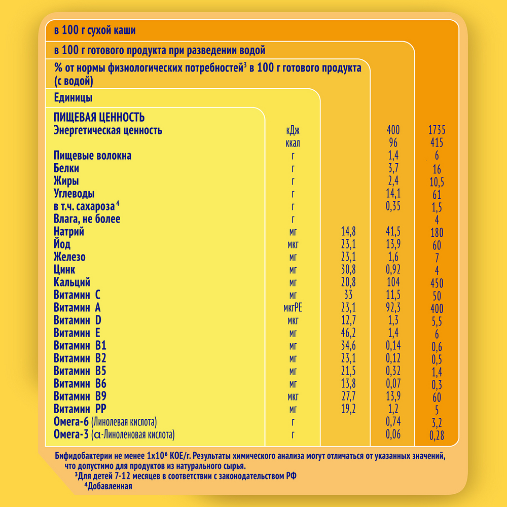 Каша приготовлена с использованием особой технологии бережного расщепления злаков CHE. Благодаря этому в продукте появляется естественный сладкий вкус, каша лучше усваивается и имеет повышенную пищевую ценность. Является полезным сбалансированным прикормом для здоровых детей.Каша обогащена пробиотиками - живыми бифидобактериями BL. Они способствуют нормализации пищеварения, росту здоровой микрофлоры и укреплению иммунитета, что очень важно в период введения прикорма.Каша содержит комплекс витаминов и минеральных веществ iRON+ для здорового роста и развития.