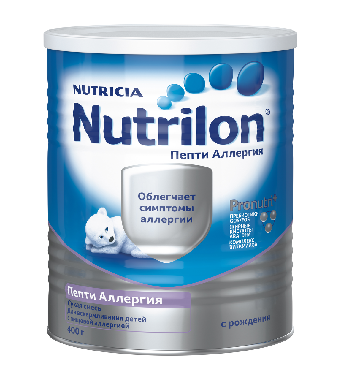 Для диетического (лечебного) питания детей с рождения. Для вскармливания детей с пищевой аллергией. Облегчает симптомы аллергии. Nutrilon Пепти Аллергия. Белки коровьего молока — частая причина аллергических заболеваний у детей первого года жизни. Поэтому в случае, если у ребенка имеются аллергические заболевания и грудного молока матери недостаточно, важно подобрать питание со сниженными аллергенными свойствами, и, вмес��е с тем, способствующее здоровому и правильному развитию. Благодаря глубоко расщепленному сывороточному белку, аминокислотный спектр которого соответствует спектру грудного молока, Nutrilon Пепти Аллергия эффективно облегчает симптомы аллергии, в том числе такие как атопический дерматит. Формула для нового поколения Nutrilon Пепти Аллергия с уникальным комплексом Pronutri+ помогает Вашему ребенку развиваться, ведь она включает: улучшенный комплекс особых жирных кислот ARA/DHA, способствующий развитию его интеллекта;