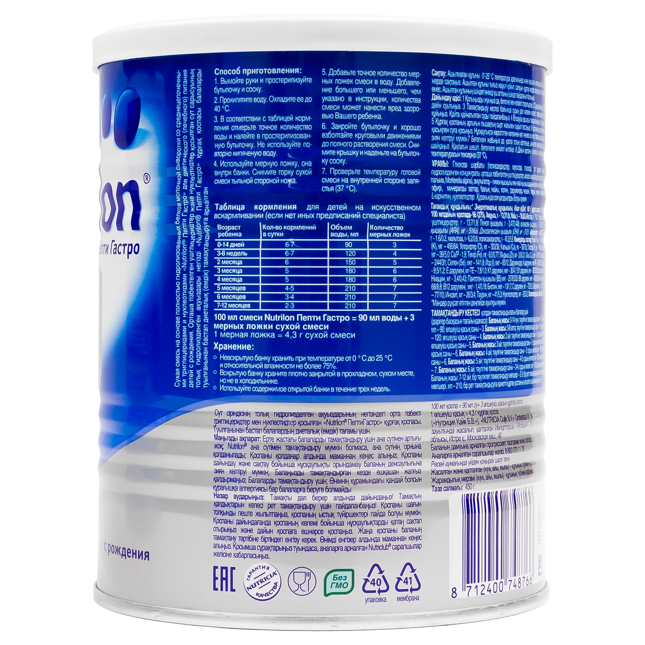 Для диетического (лечебного) питания детей с рождения. Для детей с синдромом нарушенного кишечного всасывания и пищевой непереносимостью; Облегчает симптомы пищевой непереносимости. Nutrilon Пепти Гастро. Синдром нарушенного кишечного всасывания и пищевая непереносимость могут возникать при пищевой аллергии, после операций на желудке и/или кишечнике, при нарушении всасывания жиров и воспалительных заболеваниях кишечника. Nutrilon Пепти Гастро — безлактозная смесь, разработана на основе международных рекомендаций, и подходит для длительного использования. Nutrilon Пепти Гастро облегчает симптомы пищевой непереносимости и нарушенного кишечного всасывания. Благодаря особому составу Nutrilon Пепти Гастро: имеет низкую остаточную аллергенность , обусловленную наличием специально обработанного (высокогидролизованного) сывороточного белка, аминокислотный спектр которого близок к спектру грудного молока;