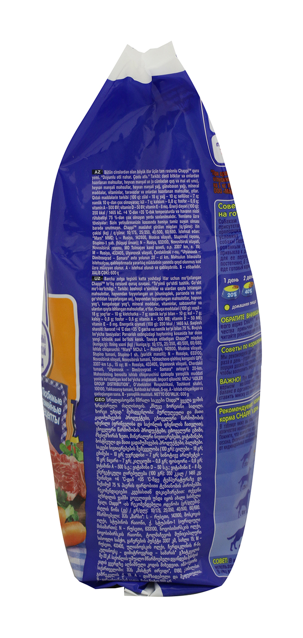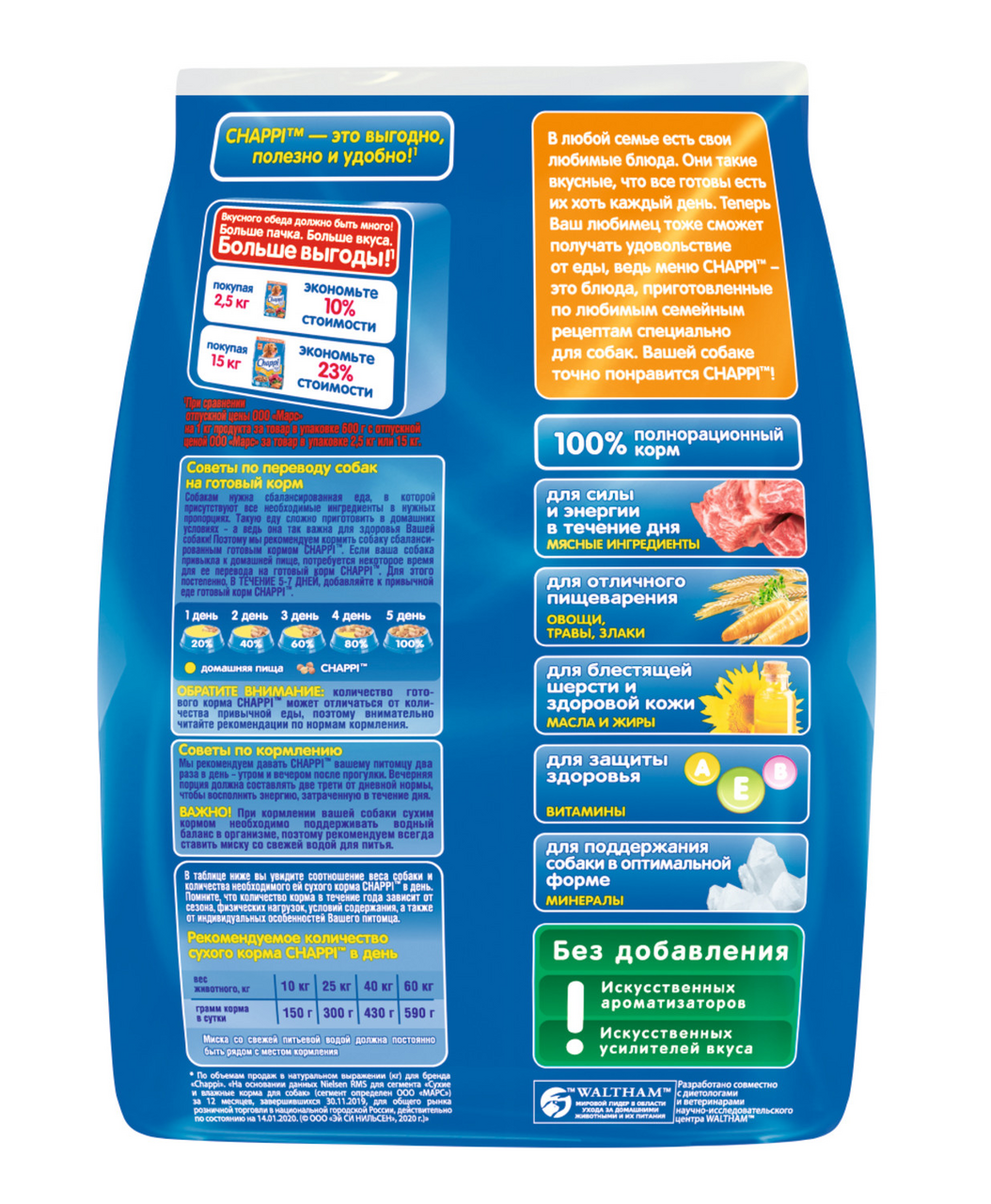 Полнорационный сухой корм Chappi сытный мясной обед "Мясное изобилие" разработан специально для ежедневного питания, подходит для всех пород собак. В составе продукта имеется мясо, крапива и ромашка, масла и жиры, позволяющие вашему питомцу выглядеть здоровым и счастливым. Содержит натуральные и полезные ингредиенты - приправу из овощей и трав. Поможет сохранить вашему животному прекрасную форму. Мозволяет обеспечить сбалансированным питанием вашего домашнего любимца. Полнорационный сухой корм для взрослых собак всех пород. Новое вкусное меню от Чаппи станет любимой едой вашей собаки. Выбирая полноценное сбалансированное питание Чаппи для Вашего любимца, вы можете быть уверены в том, что каждый день ваша собака будет довольной, игривой и здоровой. Вкусно и Полезно!-Для силы и Энергии в течение дня - Мясо.-Для отличного пищеварения - Овощи, Травы, Злаки.-Для блестящей шерсти и здоровой кожи - Масла и Жиры.-Для крепких зубов и костей - Кальций.-Для защиты здоровья - Витамины.-Для поддержания собаки в оптимальной форме - Минералы.-Не содержит Искусственных ароматизаторов, Искусственных усилителей вкуса.