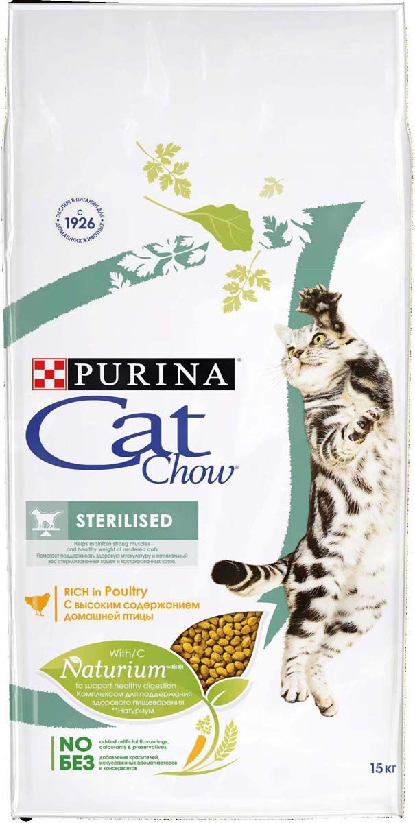 Сухой корм для стерилизованных кошек CAT CHOW с высоким содержанием домашней птицы, 15 кг богат качественным белком, натуральными компонентами. Благодаря уникальной формуле Naturium продукт состоит из волокон натуральных источников, пребиотиков. Они поддерживают нормальное состояние кожных покровов, шерсти, зубной эмали, а также микрофлору кишечника и слаженную работу органов пищеварительной системы. Витаминный и минеральный комплексы благоприятно воздействуют на работу головного мозга, мышц, сосудов и костей. Сбалансированное питание поставляет в организм взрослой кошки витамины E, В, D3, С, поддерживающие естественную его защиту. В составе отсутствуют вредные консерванты, красители и добавки. Корм предупреждает гормональные изменения, связанные со стерилизацией или кастрацией котов. Он поддерживает мускулатуру и оптимальный вес животного. Постепенно переводить его на полезное питание рекомендуется в течение недели. Продукт поставляется в удобных для хранения и использования упаковках компактных размеров. Он сохраняет питательную и энергетическую ценность в закрытом пакете на протяжение 18 месяцев. При расчете правильной порции питомец избежит различного рода заболеваний, связанных с печеночной недостаточностью, гипертрофической кардиомиопатией, диареей, рвотой, потерей веса. Приобрести сухой корм для стерилизованных кошек CAT CHOW с высоким содержанием домашней птицы, 15 кг можно в торговом центре METRO.