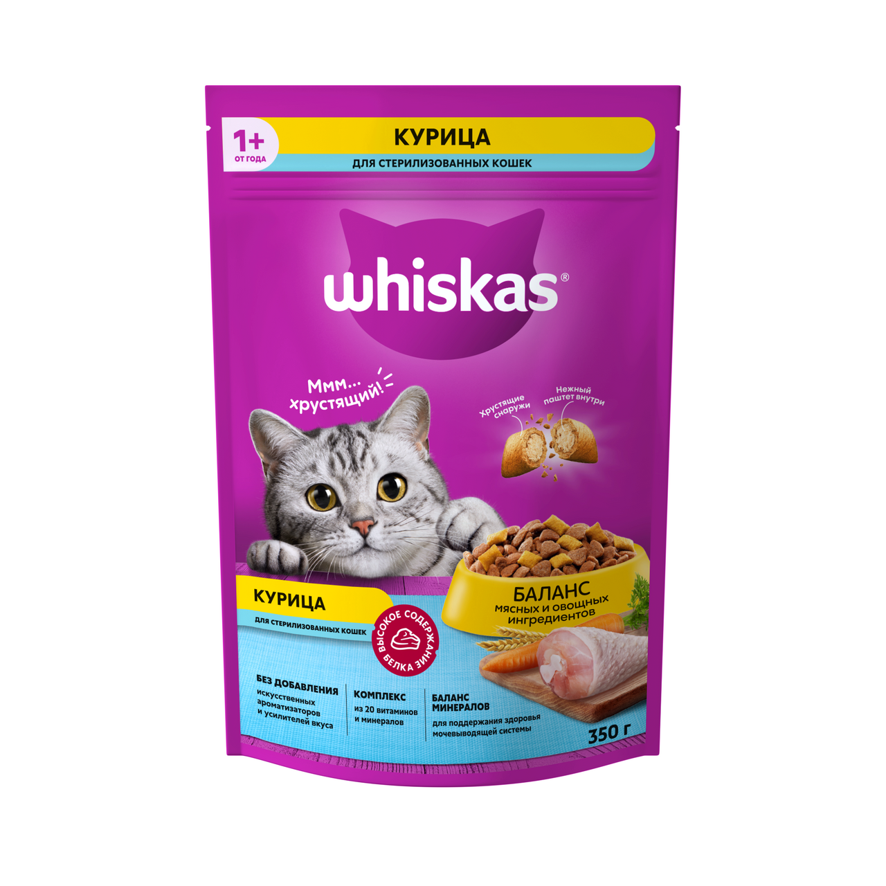 Создан специально, учитывая особые потребности Вашей любимицы. Хрустящие подушечки с нежным паштетом внутри обязательно придутся по вкусу Вашей кошке. Кроме того, Whiskas содержит все необходимое, чтобы еда Вашей стерилизованной любимицы была не только вкусной, но и полезной.