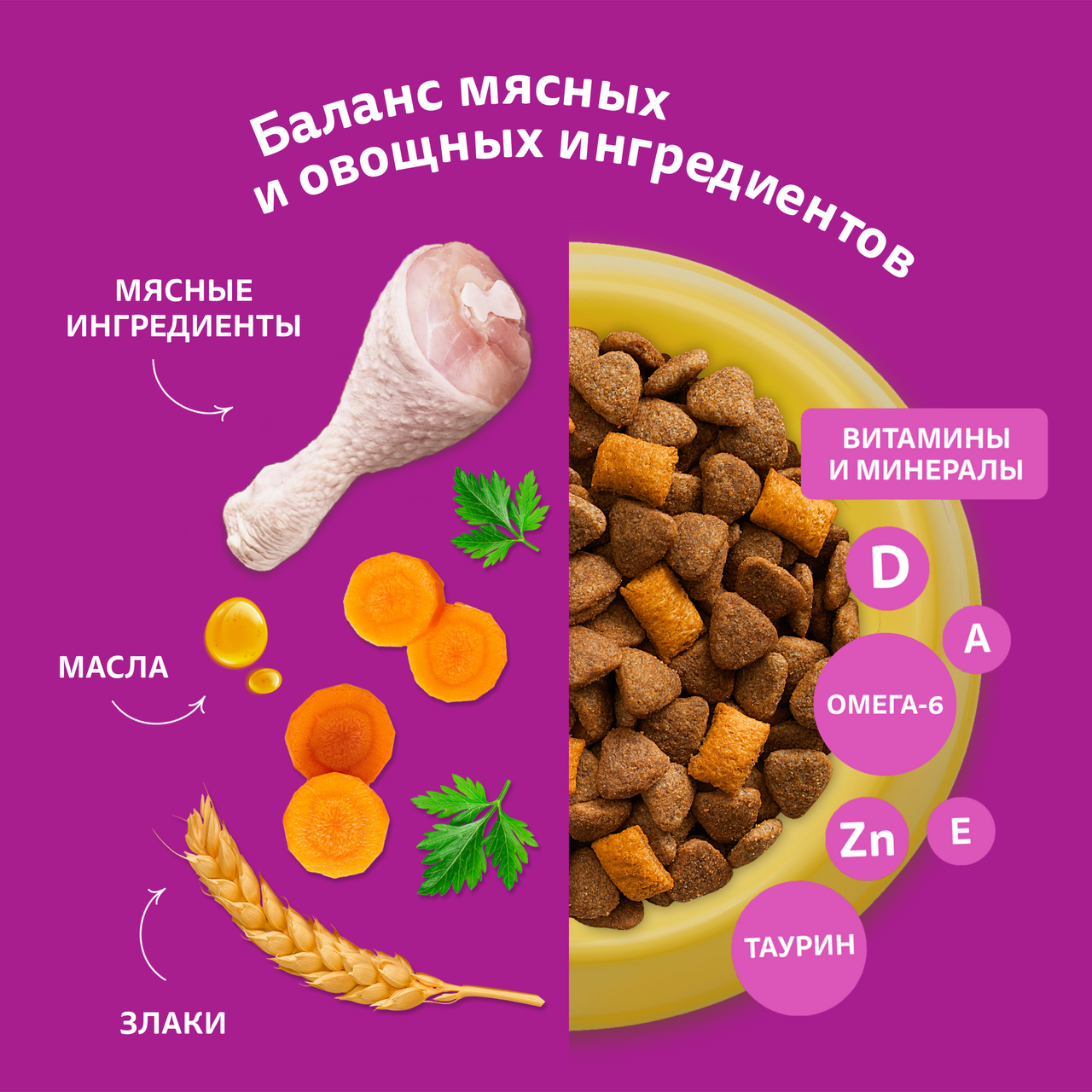 Злаки и продукты их переработки, мука животного происхождения (в том числе из курицы), растительные белковые экстракты, животные жиры и растительные масла (в том числе подсолнечное масло), гидролизат из продуктов животного происхождения, минеральные вещества, витамины, свекловичный жом, пивные дрожжи, красители, аминокислоты (в том числе таурин), морковь сушеная, антиоксиданты.