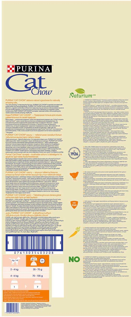 Корм сухой для взрослых кошек Purina Cat Chow Adult N1, с домашней птицей, уткой и лососем, 15 кг предназначен в период смены потребностей в кормлении у питомца. Важно, чтобы кошка получала необходимое количество полезных компонентов, процентное соотношение которых соответствует ее весу, возрасту. Сбалансированный продукт предотвращает ряд заболеваний, проявляющихся после первого года жизни. Кроме мяса в корме содержатся овощи (шпинат, морковь, цикорий), источники микро- и макроэлементов. Продукт поддерживает здоровье животного, обеспечивая организм защитой от вирусов, инфекций и различных заболеваний. Благодаря витаминам А, D3, Е, В нормализуется работа сердечной мышцы, укрепляется костный аппарат, улучшается состояние кожи и шерсти. В состав продукта входят высокий процент протеинов, поддерживающих энергетические запасы и функции мышц, суставов, сосудов. Особенностью сухого корма стала формула Naturium, обогащенная растительными волокнами. Они благоприятно воздействуют на работу пищеварительного тракта и кишечника. Продукт предотвращает развитие таких заболеваний, как гипертрофическая кардиомиопатия, диарея, потеря веса, гепатит, печеночная недостаточность. Гранулы небольшого размера обладают хрустящей текстурой и покрыты оболочкой с приятным ароматом, возбуждающим аппетит. Они хранятся в закрытой флоу-пак упаковке вдали от прямых солнечных лучей. Для животного весом 2-4 кг суточная доза ее содержимого составляет 35-70 г, а более крупного — 70-105 г. Приобрести корм сухой для взрослых кошек Purina Cat Chow Adult N1, с домашней птицей, уткой и лососем, 15 кг можно в торговом центре METRO.