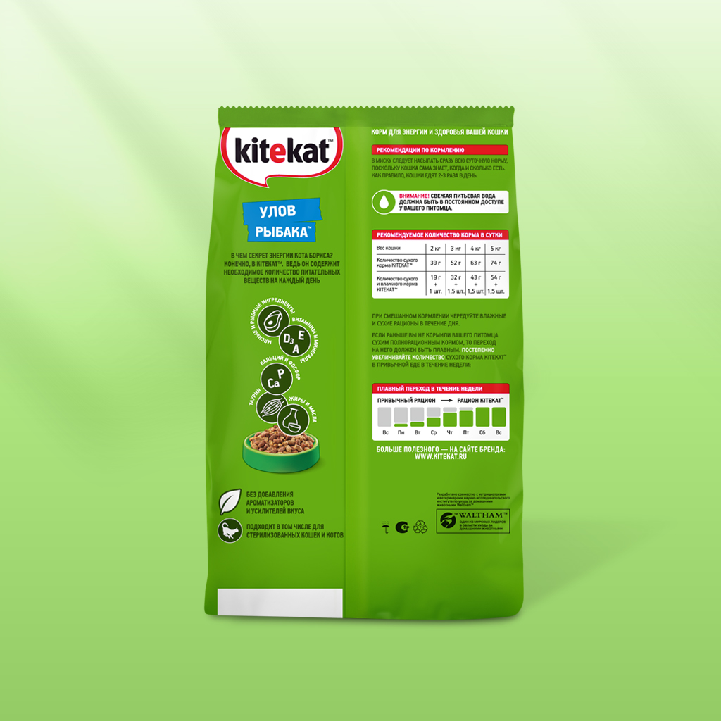 После такого обеда ваш любимец легко сможет покорить любые вершины в доме! А все потому, что Kitekat – это полноценная еда, которая содержит все необходимое для вашей кошки. Kitekat приготовлен из таких же качественных продуктов, что вы используете дома для своих близких: мясных ингредиентов, овощей, растительного масла и круп. Kitekat знает, как их правильно сбалансировать для поддержания энергии и здоровья вашего кота.