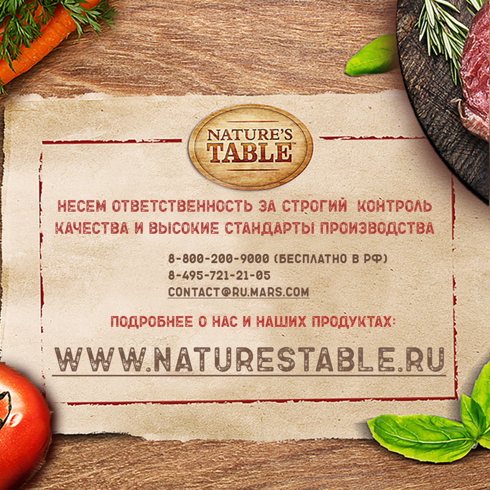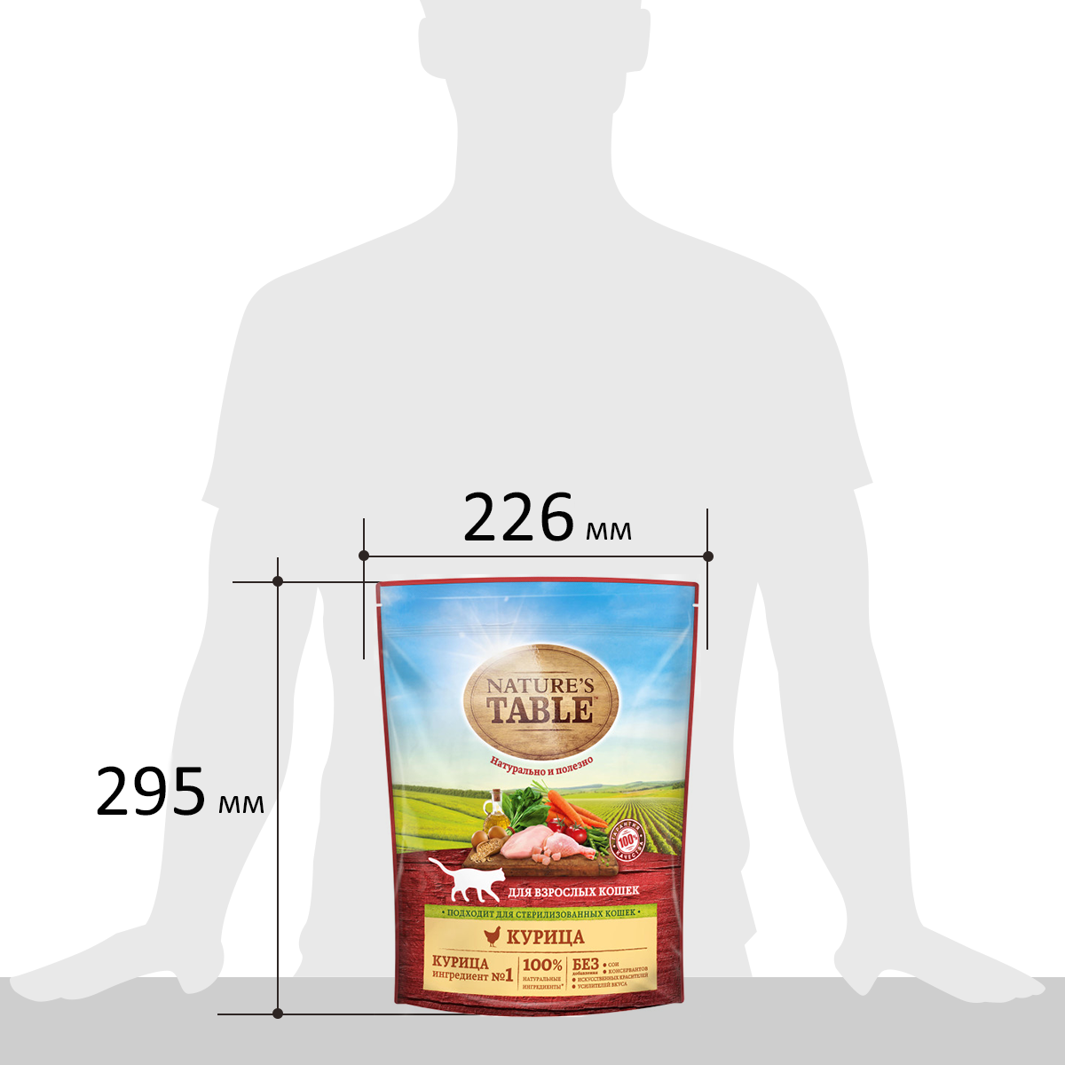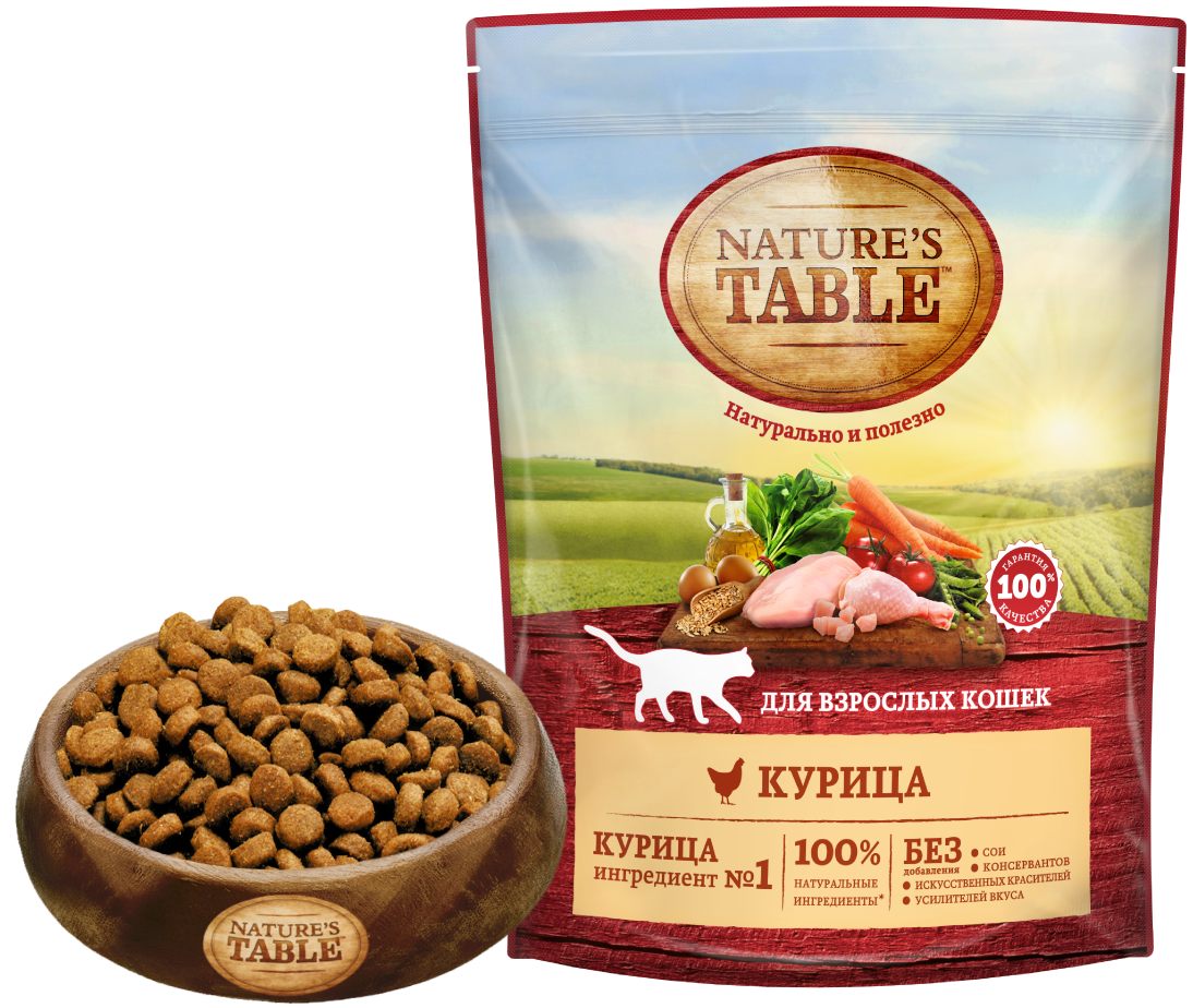 Nature’s Table натурально и полезно! Рацион для взрослых кошек Nature’s Table Курица содержит на 100% натуральные ингредиенты самого высокого качества, подходит для стерилизованных кошек. Nature’s Table – вся польза природы для вашей кошки, чтобы она радовала вас здоровьем и красотой день за днем!