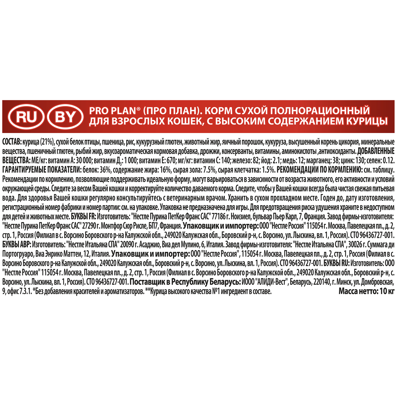 Корм сухой Pro Plan для кошек с курицей, 10кг