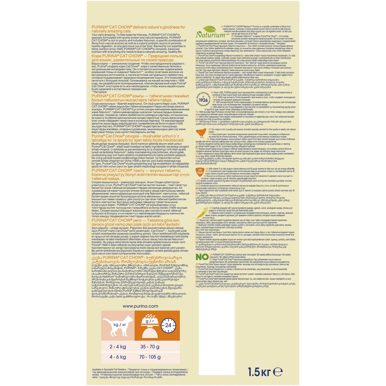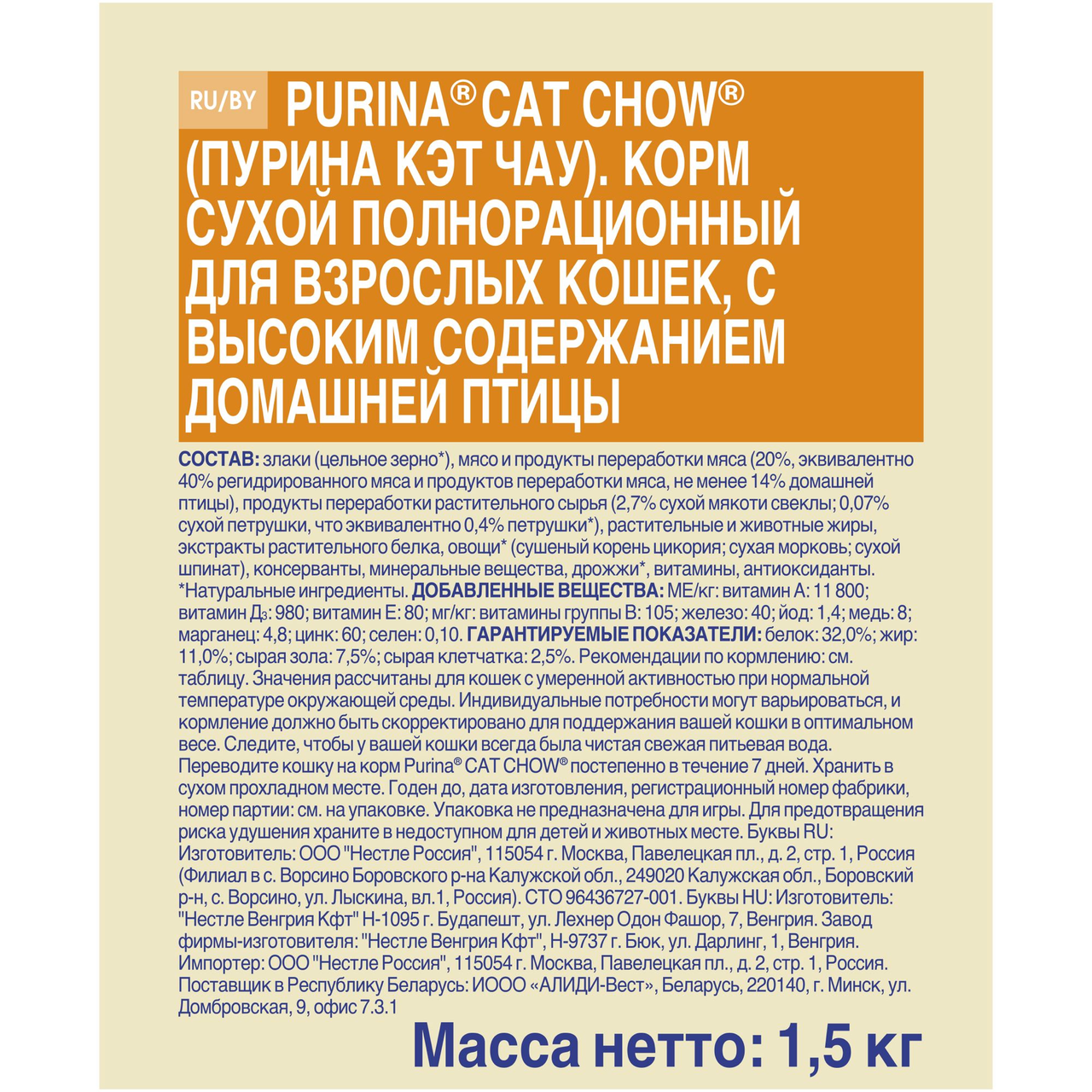 Сухой корм для кошек PURINA CAT CHOW ADULT Домашняя птица, 1,5 кг характеризуется сбалансированным и натуральным составом, высоким содержанием протеинов. Продукт обладает хрустящей текстурой и приятным ароматом, возбуждающим аппетит питомца. Благодаря витаминам Е, А, группы В поддерживается нормальное состояние кожи и шерсти, костной ткани и сердечной мышцы. В состав входят злаки, мясо и мясной продукт, растительные компоненты. Корм становится эффективной профилактикой мочекаменной болезни, уролитиаза. Комплекс витаминов и минералов поддерживает иммунную систему, предупреждая вирусные, грибковые и бактериальные инфекции, а также проблемы с ушами, глазами и печенью. В состав продукта входит специальная формула, которая представляет собой сочетание пищевых волокон. Она поддерживает оптимальную микрофлору кишечника, функции желудка и других органов ЖКТ. Также Кет Чау защищает от образования зубного камня и налета. Он полностью заменяет полнорационное повседневное питание, контролируя обмен веществ в организме. Приобрести сухой корм для кошек PURINA CAT CHOW ADULT Домашняя птица, 1,5 кг можно в торговом центре METRO. Имея более чем 80-летний опыт в области кормления животных, компания Purina создала CAT CHOW — сбалансированный корм с высоким содержанием мяса, трав и овощей, стимулирующий здоровое пищеварение и крепкий природный иммунитет вашей кошки. Все корма CAT CHOW разработаны экспертами в области ветеринарии и диетологии. Каждый корм содержит в себе оптимальное сочетание питательных веществ и энергетической ценности. На каком бы этапе жизни ни находилась ваша кошка, от котенка до пожилого животного, мы всегда готовы предложить корм CAT CHOW, который подходит именно ей. Для животных, требующих особого ухода, в ассортименте представлены специальные корма для решения специфических проблем со здоровьем, в том числе свойственным кошкам взрослого возраста.
