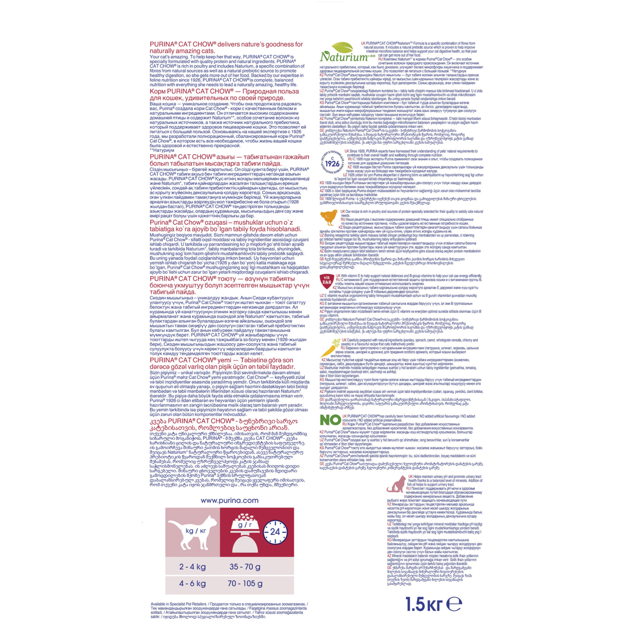 Корм сухой для кошек Purina Cat Chow Adult, Urinary Tract Health, вкус домашней птицы, 1,5 кг — питательный и полезный обед для питомца. Благодаря полезным компонентам он обеспечивает нормальное функционирование внутренних органов, сердечной мышцы, пищеварительного тракта, мозга, костей. Высокий процент домашней птицы в составе не только возбуждает аппетит животного, но и доставляет в организм протеин. Корм также содержит минеральные вещества, витамин Е, отвечающий за репродуктивную функцию и окислительные процессы. Витамины группы B поддерживают нервную систему, зрительный нерв и состояние кожи, шерсти. Микро- и макроэдлементы благоприятно воздействуют на метаболизм и работу сердца. Омега-3 жирные кислоты препятствуют воспалениям и поддерживают здоровье мочеполовой системы, pH мочи, предупреждая уролитиаз, почечную недостаточность, потерю веса, диарею, инфекционные и вирусные заболевания. Специалисты Purina разработали уникальную формулу Naturium, состоящую из пищевых волокон, которые заботятся о микрофлоре кишечника и желудка. Натуральные пребиотики положительно сказываются на состоянии ЖКТ. В составе отсутствуют искусственные добавки и вредные компоненты, которые негативно влияют на самочувствие и здоровье питомца. Продукт поставляется в удобной флоу-пак упаковке, которую можно хранить в кухонном пенале или брать с собой в поездки, путешествия. Для кошек мелкой породы суточная доза корма составляет 35-70 г, для средней (от 6 кг) — 100 г. Этот продукт можно давать как в сухом, так и в размоченным виде. Приобрести корм сухой для кошек Purina Cat Chow Adult, Urinary Tract Health, вкус домашней птицы, 1,5 кг можно в торговом центре METRO.
