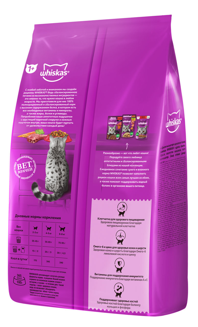 Это сбалансированный рацион для здоровой и счастливой жизни Вашей кошки. Хрустящие подушечки с нежным паштетом внутри обязательно придутся по вкусу Вашей любимице. Кроме того, Whiskas содержит все необходимое, чтобы еда Вашей кошки была не только вкусной, но и полезной. Whiskas это: Оптимальное сочетание питательных веществ и нутриентов для подержания обмена веществ, Витамин Е и цинк для иммунитета, Омега-6 и цинк для здоровья кожи и шерсти, Баланс кальция и фосфора для здоровья костей, Витамин А и таурин для хорошего зрения. Высокоусваиваемые ингредиенты и клетчатка для пищеварения. Сухая текстура корма для удаления зубного налета.