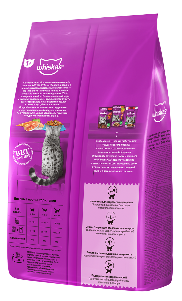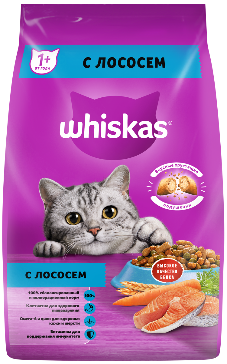 Это сбалансированный рацион для здоровой и счастливой жизни Вашей кошки. Хрустящие подушечки с нежным паштетом внутри обязательно придутся по вкусу Вашей любимице. Кроме того, Whiskas содержит все необходимое, чтобы еда Вашей кошки была не только вкусной, но и полезной.
