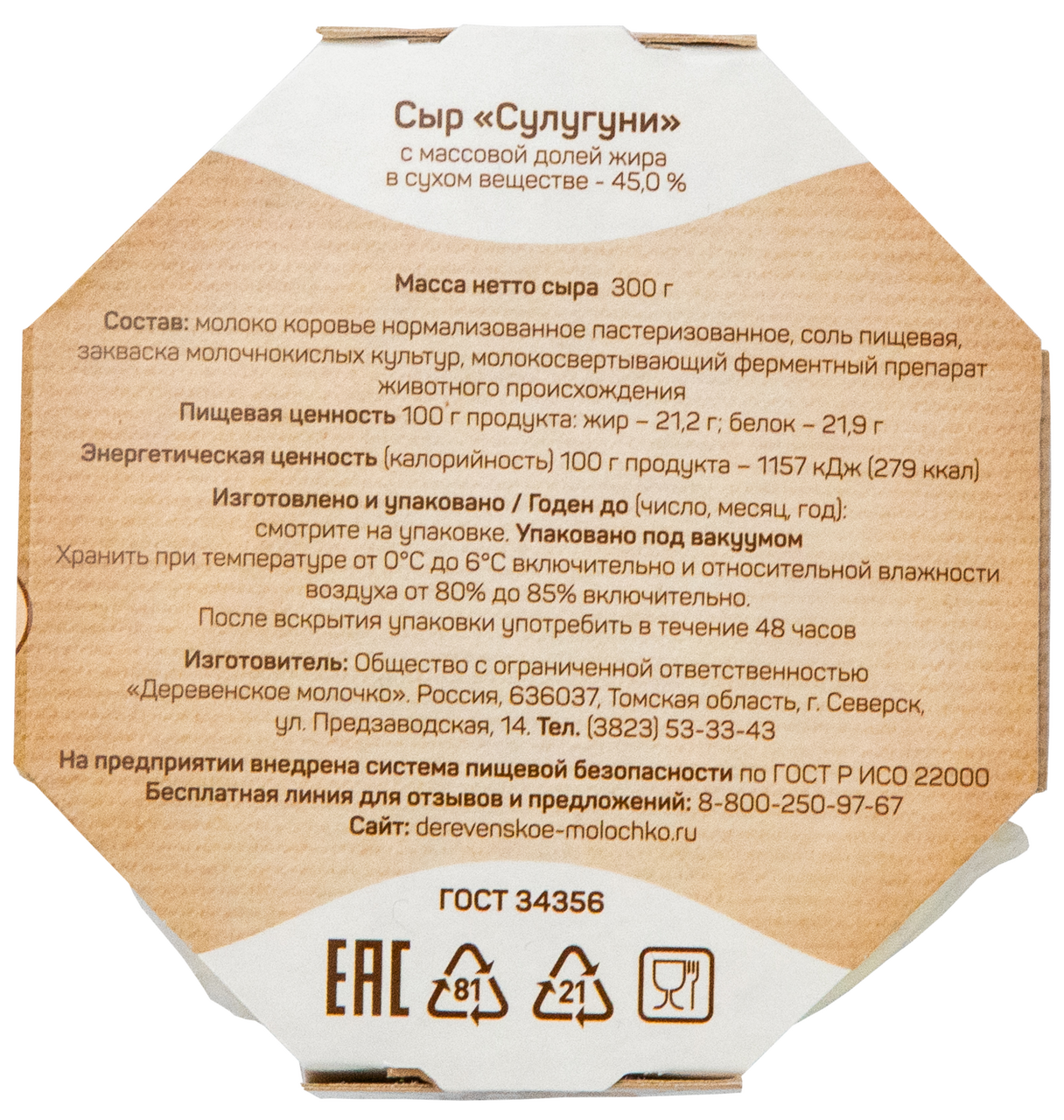Сыр Сулугуни Деревенское молочко, 300 г — молочный продукт, выполненный по традиционным грузинским рецептам. Его изготавливают из свежего коровьего молока, а в процессе производства сыр подвергается плавлению, благодаря чему приобретает приятный кисловато-соленый молочный вкус, сливочный аромат и тягучую и одновременно слоящуюся структуру. В составе Сулугуни содержится много питательных веществ: витаминов группы В, А, С, ��, а также макро- и микроэлементов: кальция, фосфора, железа, меди, калия и многих других. Такой продукт в рационе питания благоприятно воздействует на состояние здоровья человека: стимулирует работу желудочно-кишечного тракта, запускает обмен веществ и метаболизм, снижает содержание холестерина в крови, улучшает состояние кожи, волос и ногтей, дарит чувство бодрости. Представленный продукт подают к столу в нарезанном виде в качестве закуски к вину и кофе. Его также можно жарить и коптить. Также сыр сулугуни добавляют в овощные салаты, используют в качестве начинок для выпечки (пирогов, запеканок, пирожков), посыпают им хачапури и лаваш. Такой продукт готовят с мясом, овощами, птицей и яйцами. При термической обработке сулугуни расплавляется и передает свой нежный вкус всему блюду.