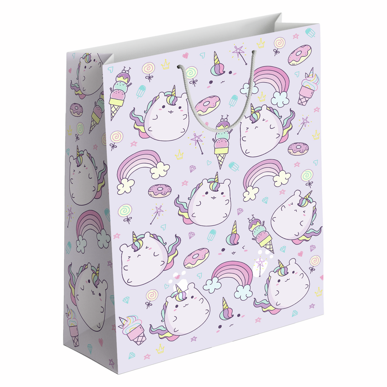 Сумка бумажная Единорог с мороженым, 24 x 33 x 10см - это стильный и практичный вариант упаковки подарка. Красочное изображение, стильный рисунок - все для оригинального оформления подарка. Эффект: матовая ламинация.