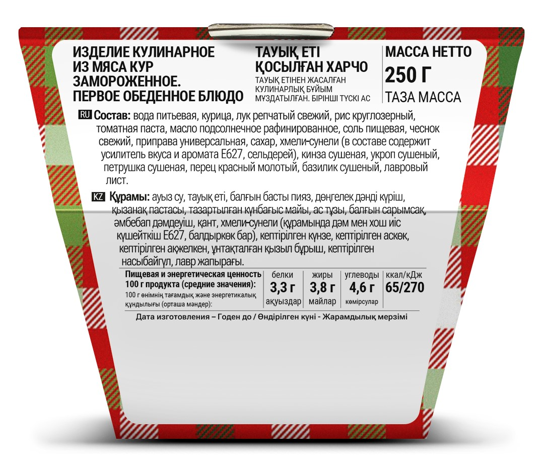 Традиционное первое обеденное блюдо, содержащее в своем составе курицу, лук репчатый, крупу рисовую, специи, пряности, чеснок свежий, изготовлено обычным способом, порционно расфасовано и заморожено. Перед употреблением суп нужно просто разогреть в микроволновой печи.