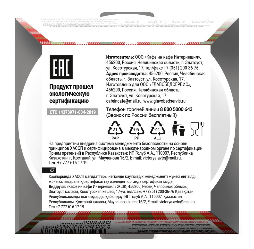 Вода питьевая, курица, лук репчатый свежий, рис круглозерный, томатная паста, масло подсолнечное рафинированное, соль пищевая, чеснок свежий, приправа универсальная, сахар, хмели-сунели (в составе содержит усилитель вкуса и аромата Е627, сельдерей), кинза сушеная, укроп сушеный, петрушка сушеная, перец красный молотый, базилик сушеный, лавровый лист.
