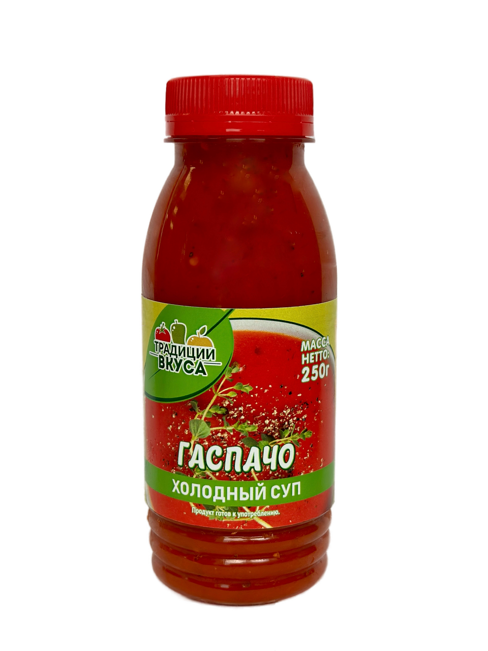 Этот холодный суп родом из Испании — достойный конкурент окрошке! Он очень лёгкий и освежающий, с ярким вкусом и соблазнительным ароматом. Гаспачо приготовлен из томатов пилати и свежих овощей: помидоров, огурцов, сладкого перца, сельдерея. Идеально дополняют вкус пикантный чеснок, душистый базилик и кисло-сладкий Вустерский соус с уксусом, анчоусами и специями.