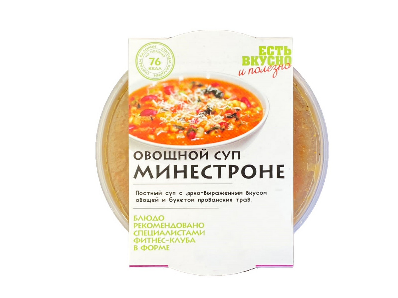 Кулинарное изделие: Овощной суп Минестроне. Состав: вода, картофель, перец сладкий свежий, помидоры, капуста цветная, фасоль красная, фасоль стручковая, морковь, лук репчатый, паста томатная, масло растительное подсолнечное, сахар, соль, чеснок, петрушка, кулинарная приправа (базилик, майоран, розмарин, шалфей, чабер, орегано, тимьян, мята), лавровый лист.