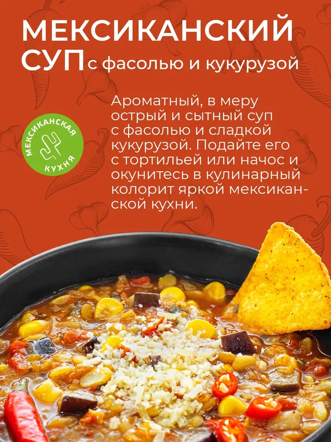 Ароматный, в меру острый и сытный суп с фасолью и сладкой кукурузой. Подайте его с тортильей или начос и окунитесь в кулинарный колорит яркой мексиканской кухни.
