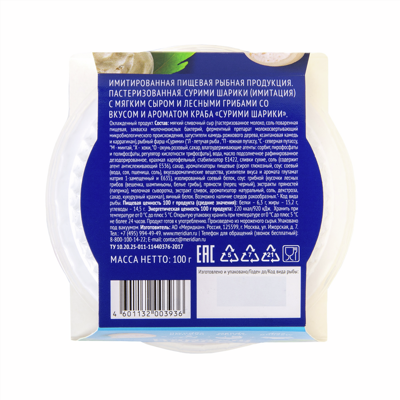 Сурими Меридиан шарики мягкий сыр-лесные грибы, 100г
