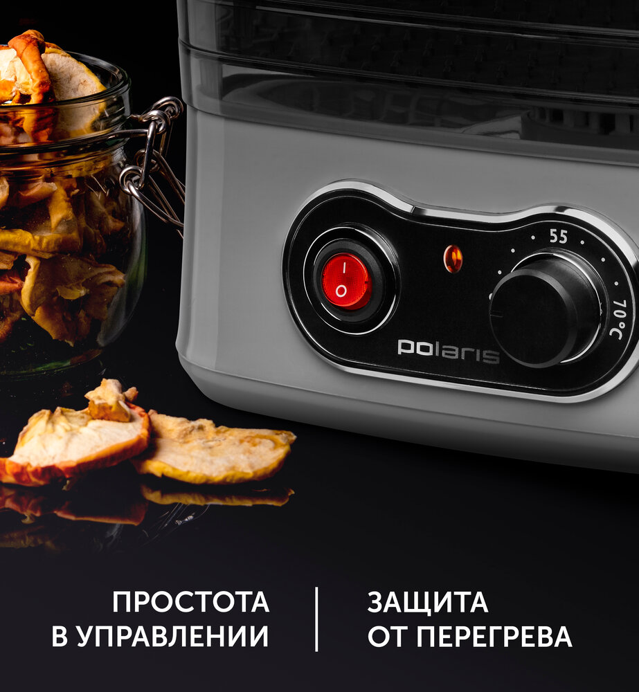 Cушилка для овощей и фруктов Polaris PFD 2505 порадует всех приверженцев здорового образа жизни и правильного питания. Прибор имеет пять практичных секций с прозрачными стенками, благодаря которым можно контролировать процесс. Температуру в данной модели можно регулировать вручную. От перегрева устройство защищено специальной функцией. Устройство предназначено для сушки овощей и грибов, фруктов и ягод путем обезвоживания. Такой прибор позволит сделать полезную заготовку на зиму и побаловать себя натуральной пастилой, которая станет отличной заменой калорийным пирожным и тортам. Ко всему прочему такую полезную сушку с абсолютно чистым составом можно давать даже детям. Модель выдержана в стильном дизайне и универсальном цвете, поэтому органично впишется в любой интерьер и не привлечет к себе лишнего внимания. А за счет компактных размеров и небольшого веса устройство можно взять с собой на дачу.