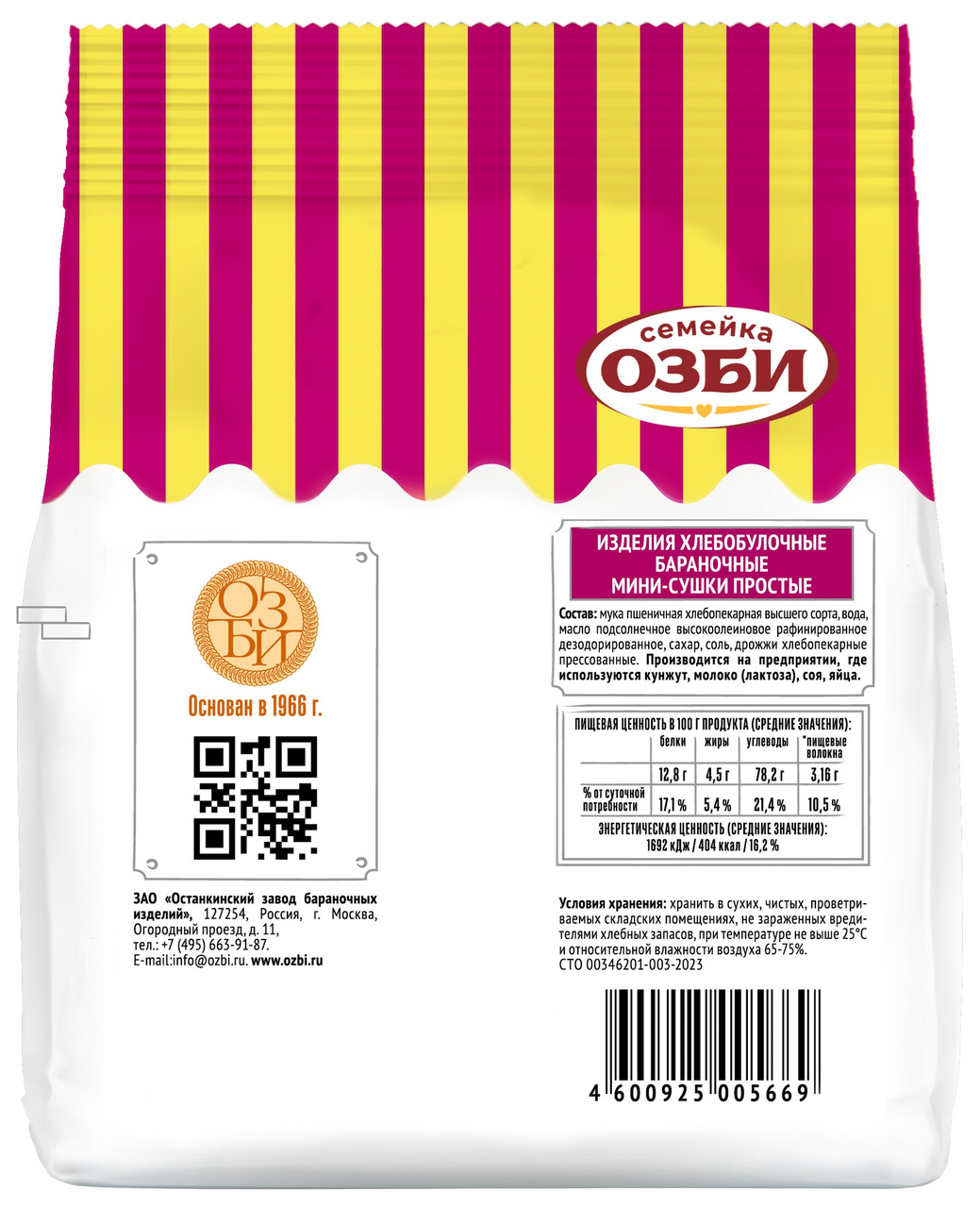 Мини-сушки Семейка Озби простые – прекрасный натуральный продукт без красителей и консервантов. Может употребляться, как взрослыми, так и детьми. Хотите отдохнуть за чашечкой чая? Возьмите с собой мини-сушки, они не только быстро и эффективно справятся с голодом, но и помогут вам зарядиться энергий и улучшить настроение. Производится кондитерское изделие по старинному классическому рецепту. Для него используются только ингредиенты высочайшего качества, поэтому он не вызывает аллергии.