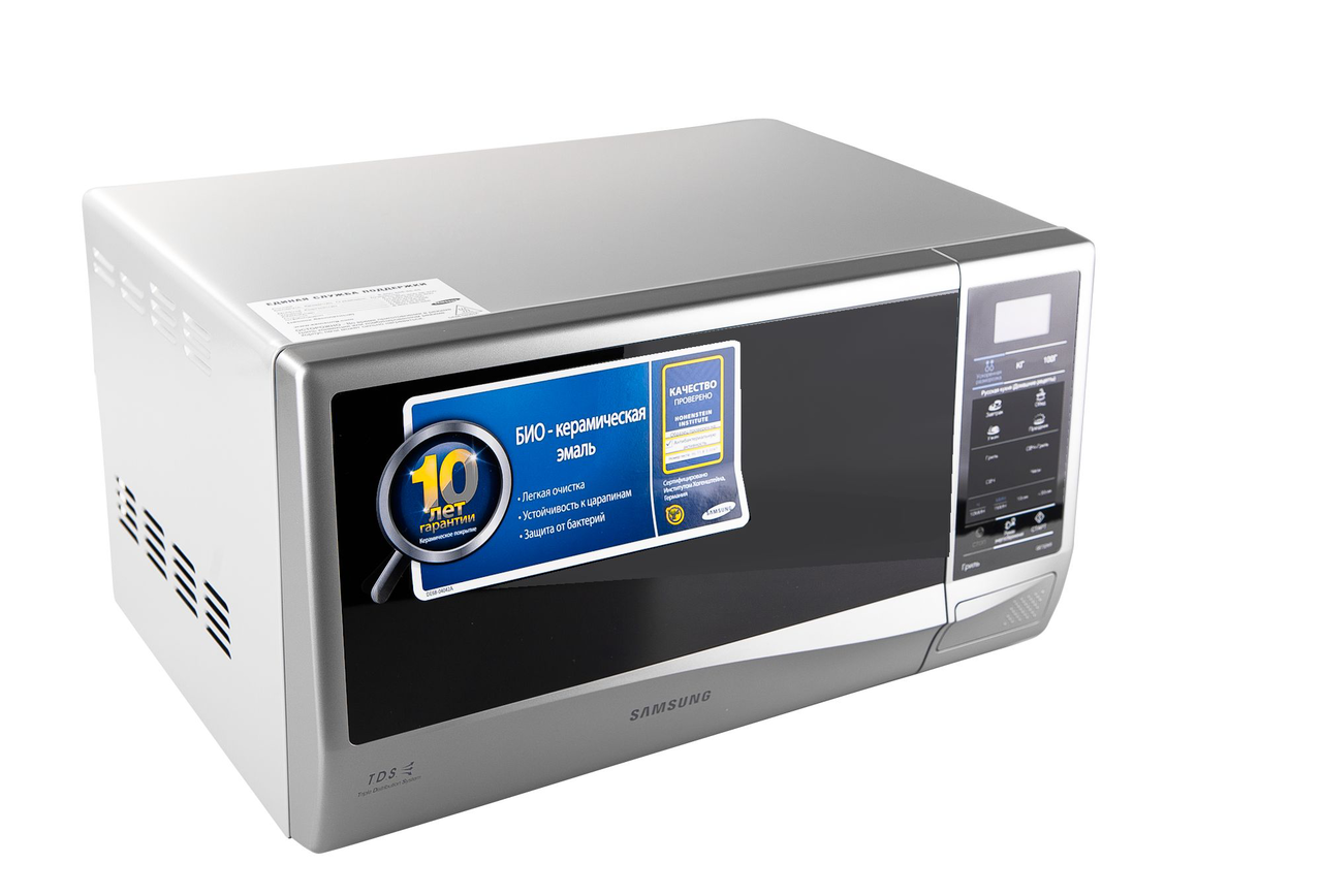 СВЧ Samsung GE-732KR-S. Внутренний объем: 20 л. Размеры: 48,9 x 27,5 x 34,3 cм. Внутреннее покрытие камеры: биокерамическая эмаль. Вес: 11 кг. Гриль: есть, тэновый. Мощность микроволн: 800 Вт. Количество уровней мощности: 7. Комбинированные режимы: микроволны + гриль. Тип управления: электронный. Дисплей есть. Переключатели сенсорные. Таймер на 99 мин. Есть режим разморозки. Есть автоматическое приготовление. Есть автоматическая разморозка. Система равномерного распределения микроволн, подсветка камеры, звуковой сигнал, отключение звукового сигнала. Дверца навесная. Кнопка открывания дверцы. Цвет: серебристый.