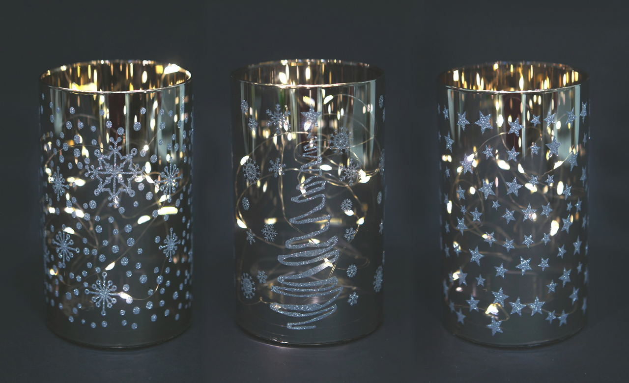 Свеча в стакане с ажурным узором (снежинки, елки, звезды). При включении создает красивые световые узоры на стенах. Ее можно использовать как украшение перед праздником, декор, как детский ночник или для романтичного настроения вечером. Можно размещать где угодно: на полке, в ванной, рядом с елкой, в детских комнатах, в саду. И не бояться возгорания.