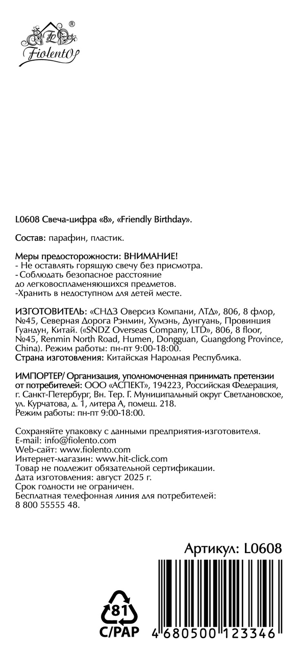 Свеча-цифра Fiolento Friendly Birthday 8
