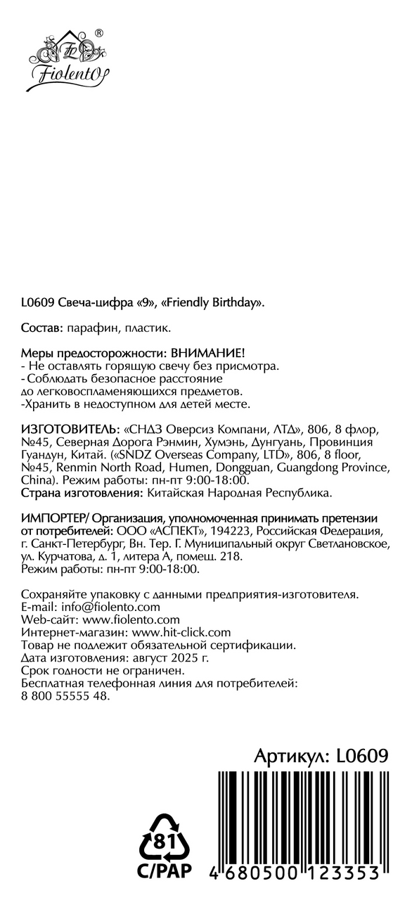 Свеча-цифра Fiolento Friendly Birthday 9