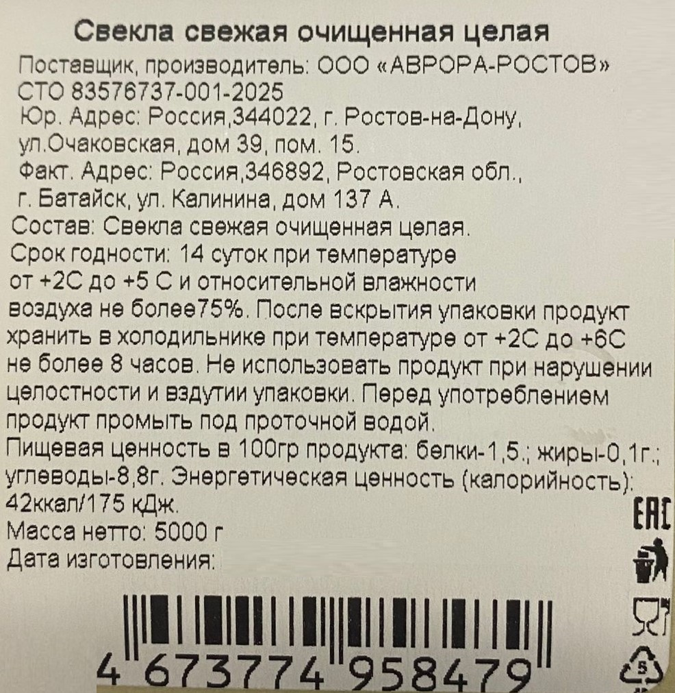 Свекла Аврора-Ростов очищенная целая, 5кг