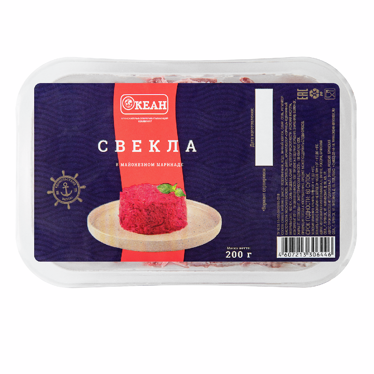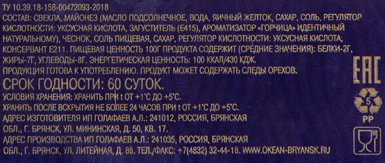 Свекла, майонез масло подсолнечное, вода, яичный желток, сахар, соль, регулятор кислотности уксусная кислота, загуститель Е415, ароматизатор горчица идентичный натуральному, чеснок, соль пищевая, сахар, регулятор кислотности: уксусная кислота, консервант Е211.