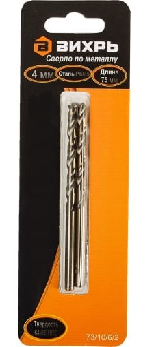 Сверла по металлу Р6М5 4 мм изготовлены методом вышлифовывания профиля, что позволяет инструменту выдерживать значительные нагрузки при сверлении трудно обрабатываемых материалов. Поперечная режущая кромка удалена при помощи подточки, облегчающей процесс засверливания, так же благодаря подточке уменьшается потребность в прикладывании значительных физических усилий при работе. Угол заточки наконечника – 135 градусов. Данные сверла изготовлены из высокопроизводительной быстрорежущей стали Р6М5, придающей инструменту дополнительную твердость и теплостойкость. Так же они подвержены термо-химической обработке, что повышает их износостойкость. В результате этой обработки они приобретают жёлтый оттенок. Твёрдость – 64-66 HRC.