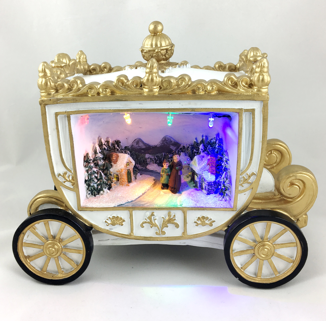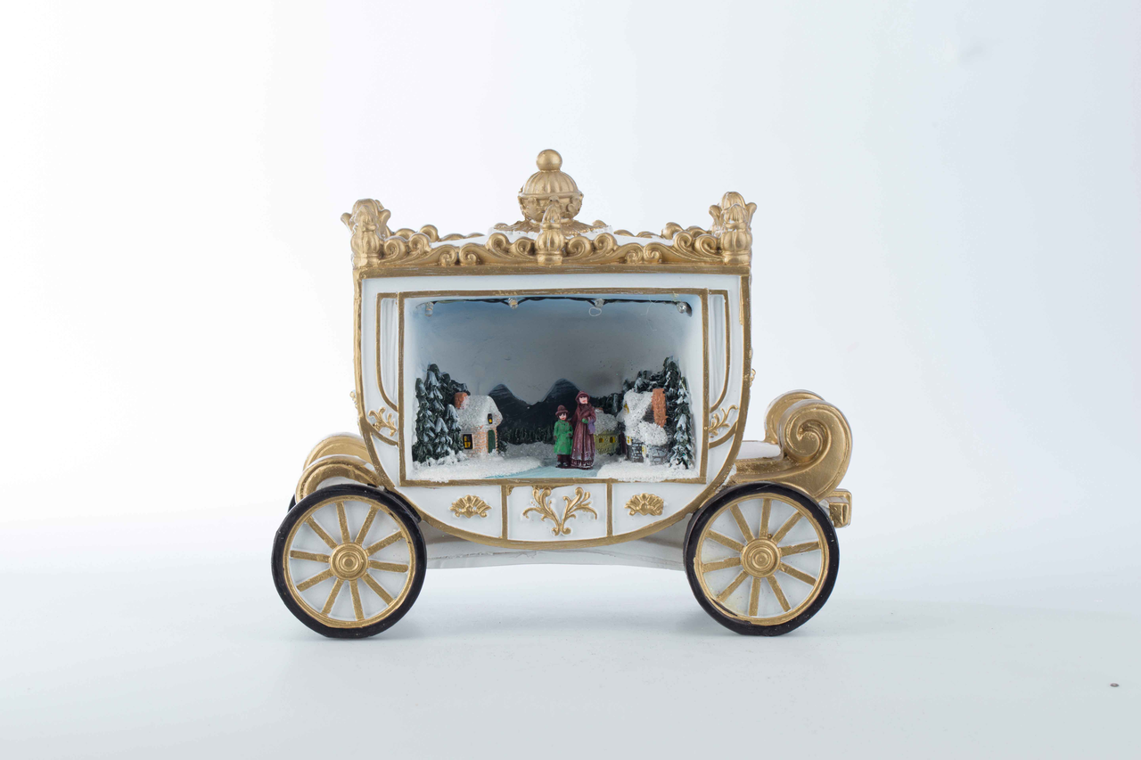 Светильник декоративный Карета — небольшой аксессуар, который привнесет в ваш дом атмосферу праздника и уюта. Подготовка дома к Рождеству и Новому году — одна из самых любимых традиций во многих семьях, которую как дети, так и взрослые ждут с нетерпением целый год. Представленное изделие очень символично — оно выглядит, как праздничная карета белого цвета с золотистыми декоративными элементами, внутри которой располагается настоящая рождественская сценка: по заснеженной деревушке среди домиков и елей идет женщина с ребенком. Сверху над ними висят разноцветные огоньки, которые эффектно подсвечивают композицию. Размер такого светильника 22,5х11,7х18,5 см — он достаточно компактный, а значит его можно разместить на столе, на полке, на камине или даже под н��вогодней елкой. Эта Карета наверняка понравится детям — она ассоциируется с зимними сказками, ощущением волшебства и рождественского чуда.