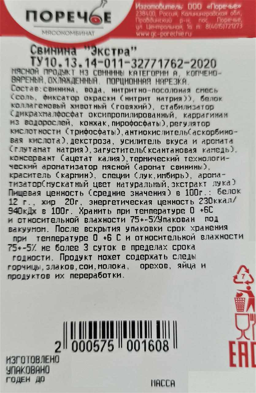 Свинина, вода, нитритно-посолочная смесь (соль, фиксатор окраски (нитрит натрия)), белок коллагеновый животный (говяжий), стабилизатор (дикрахмалфосфат оксипропилированный, каррагинан из водорослей, конжак, пирофосфаты), регулятор кислотности (трифосфаты), антиокислитель (аскорбиновая кислота), декстроза, усилитель вкуса и аромата (глутамат натрия), загуститель (ксантановая камедь), консервант (ацетат калия), термический технологический ароматизатор мясной (аромат свинины), краситель (кармин), специи (лук, имбирь), ароматизатор (мускатный цвет натуральный, экстракт лука).