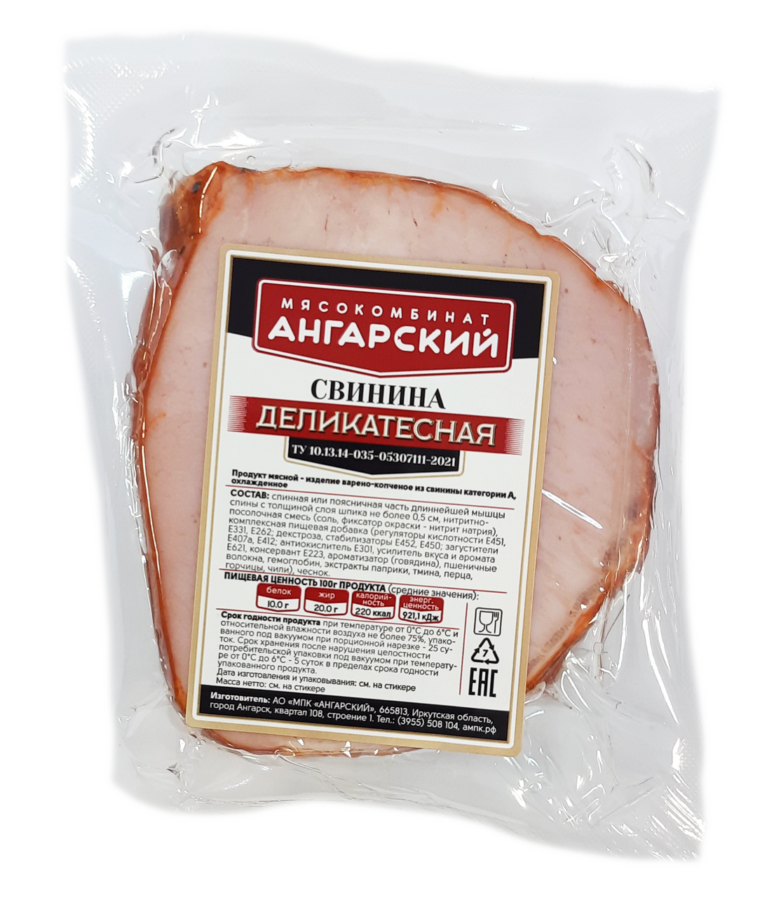 Свинина Ангарский Деликатесная, ~300г изысканное угощение для истинных любителей мяса. Изготовлена из отборной свинины и пряностей. Нежное мясо с легкими вкраплениями шпика, изысканные пряности придают пикантный, уникальный вкус. Нарезанный тонкими ломтиками деликатес может стать как настоящим украшением праздничного стола, так и питательным, вкуснейшим завтраком.