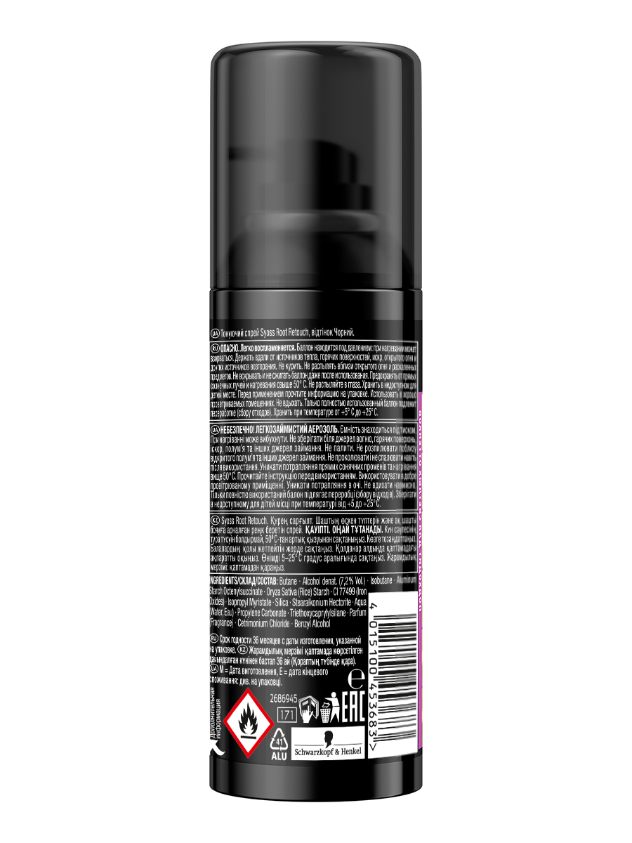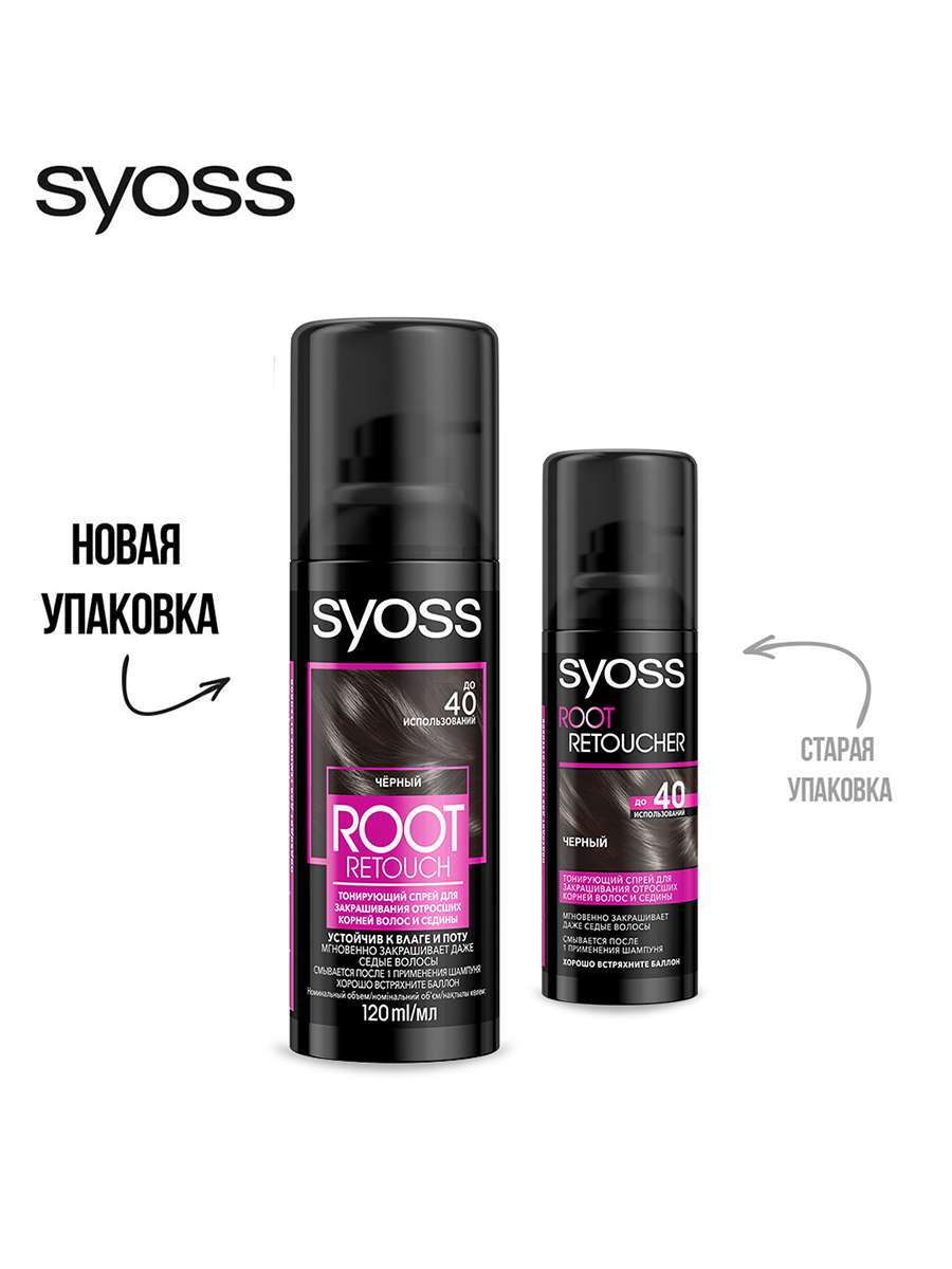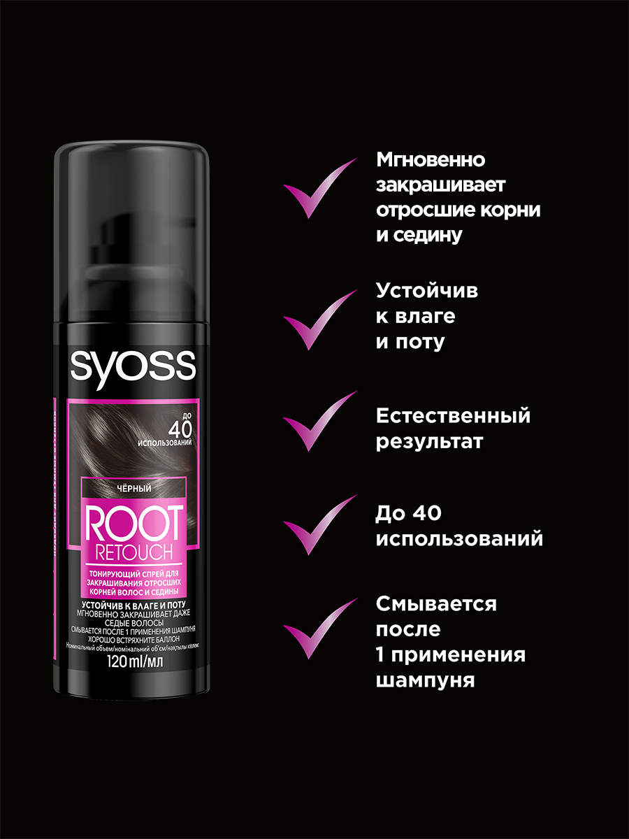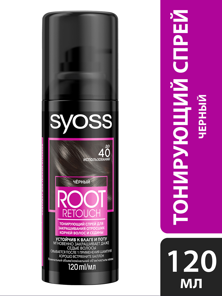 Тонирующий спрей для закрашивания отросших корней волос и седины Сьёсс Root Retoucher Чёрный. Мельчайшие частицы окрашивающего пигмента обволакивают каждый волос для мгновенной маскировки отросших корней волос и седины. Быстро высыхает и гармонично принимает цвет основной длины волос, обеспечивая равномерный результат. Точное распыление позволяет нанести продукт непосредственно на отросшие корни волос. Результат держится до следующего мытья головы. Продукт расcчитан до 40 применений.