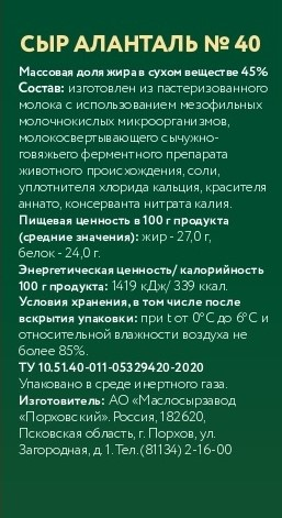 Сыр Аланталь №40 полутвердый 45%, 190г