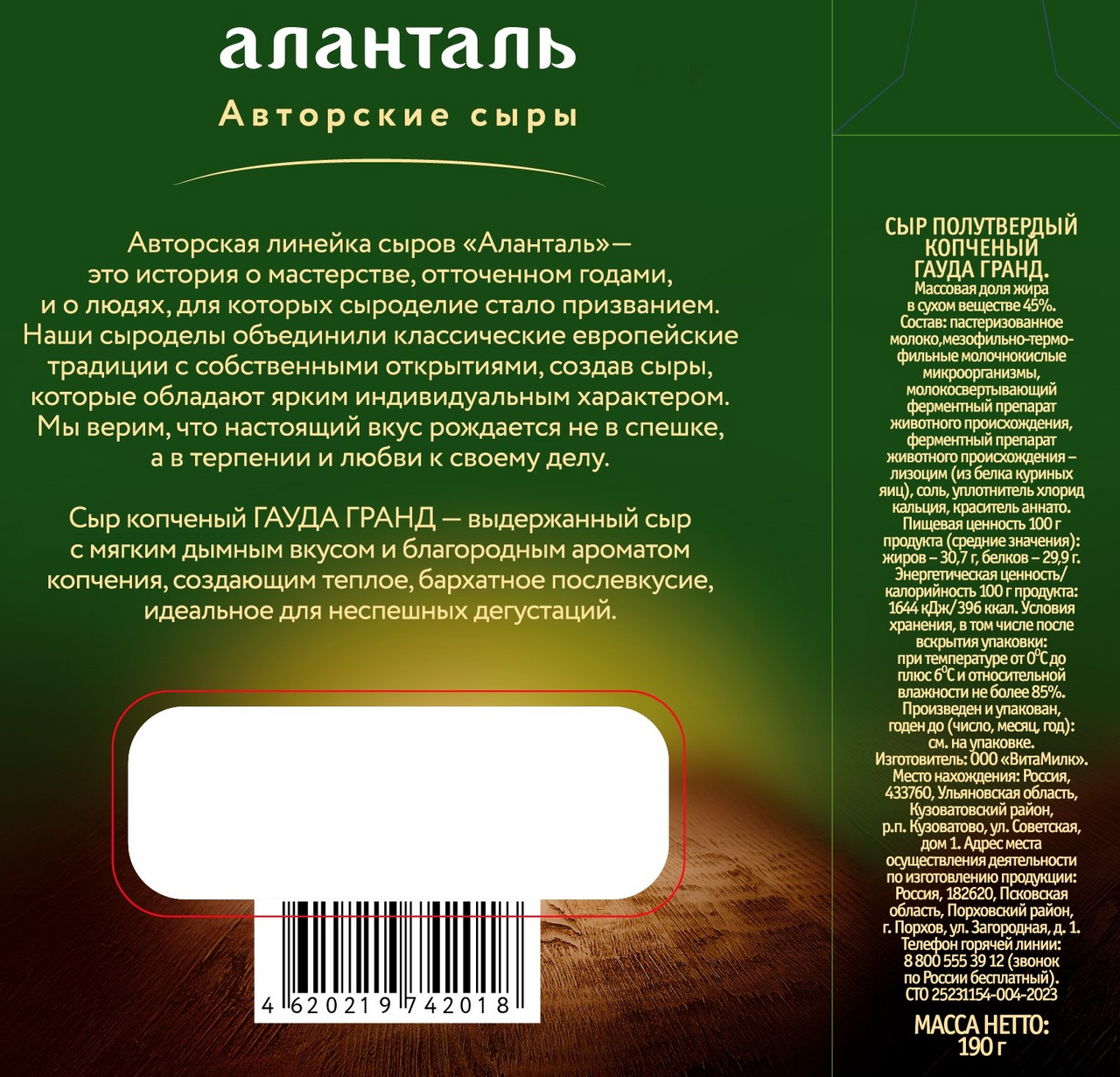 Сыр Аланталь Гауда гранд копченый кусок 45%, 190г