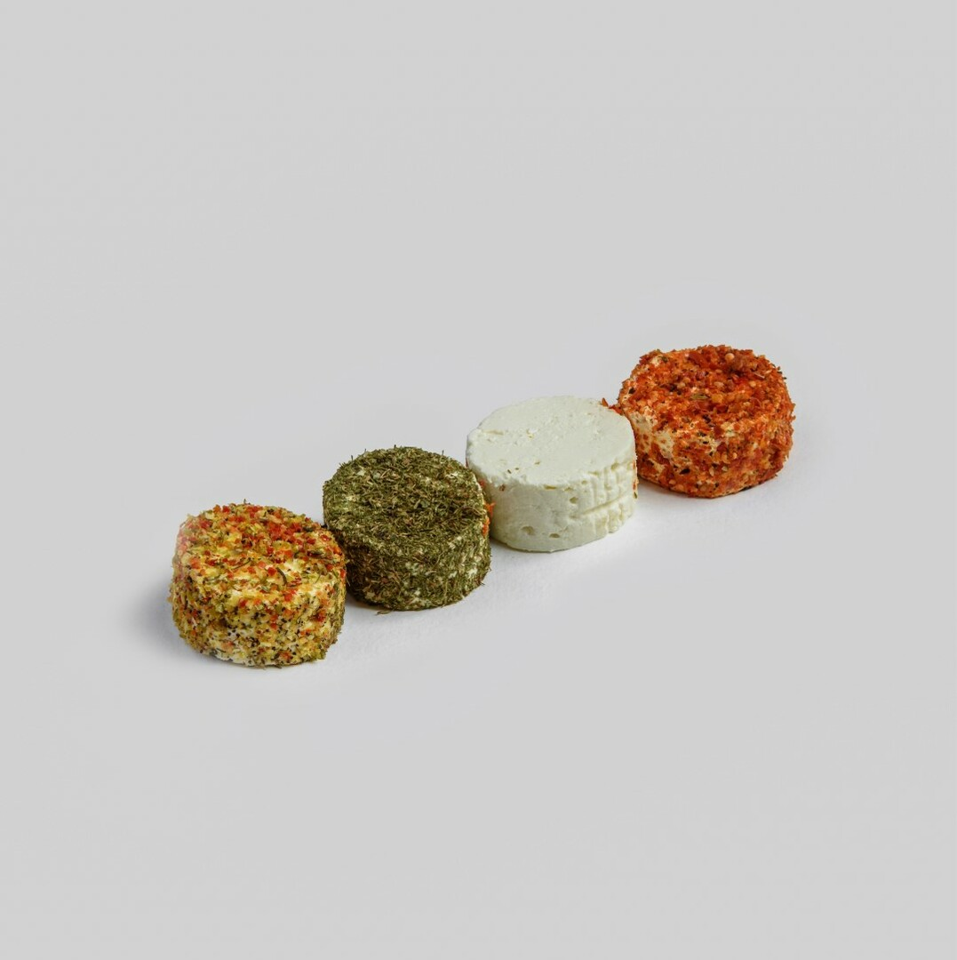 В него входят сыры в специях и пряностях: Бюш молодой из коровьего молока, в обсыпке Малахитовая, в обсыпке Пикантная с укропом и острой обсыпке Азиатская.