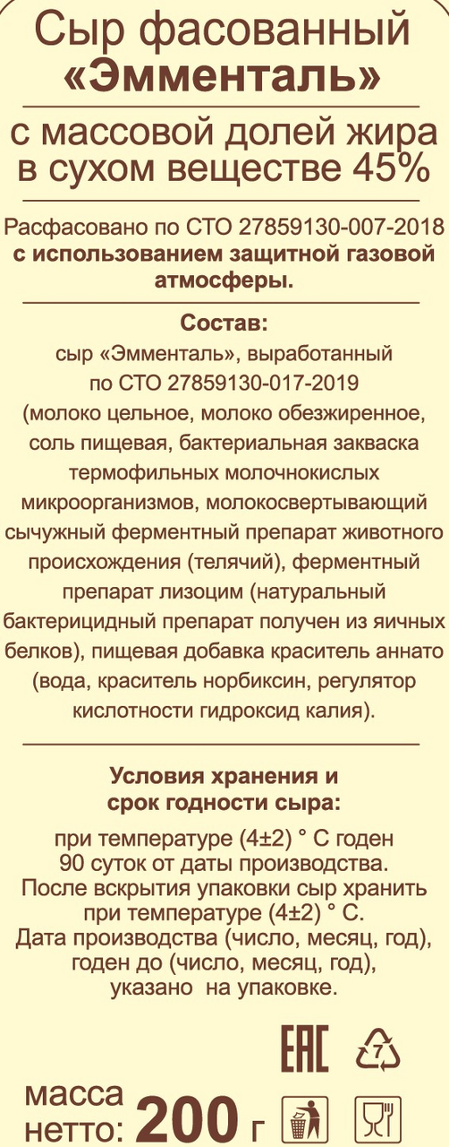 Сыр Азбука сыра Эмменталь кусок 45%, 200г