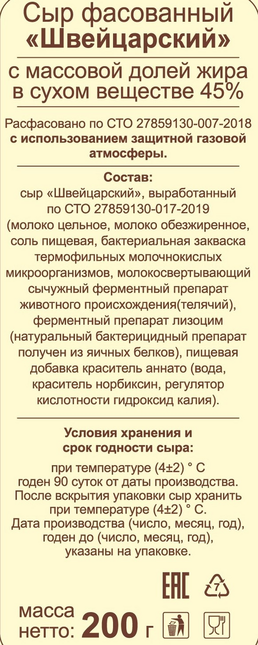 Сыр Азбука сыра Швейцарский кусок 45%, 200г