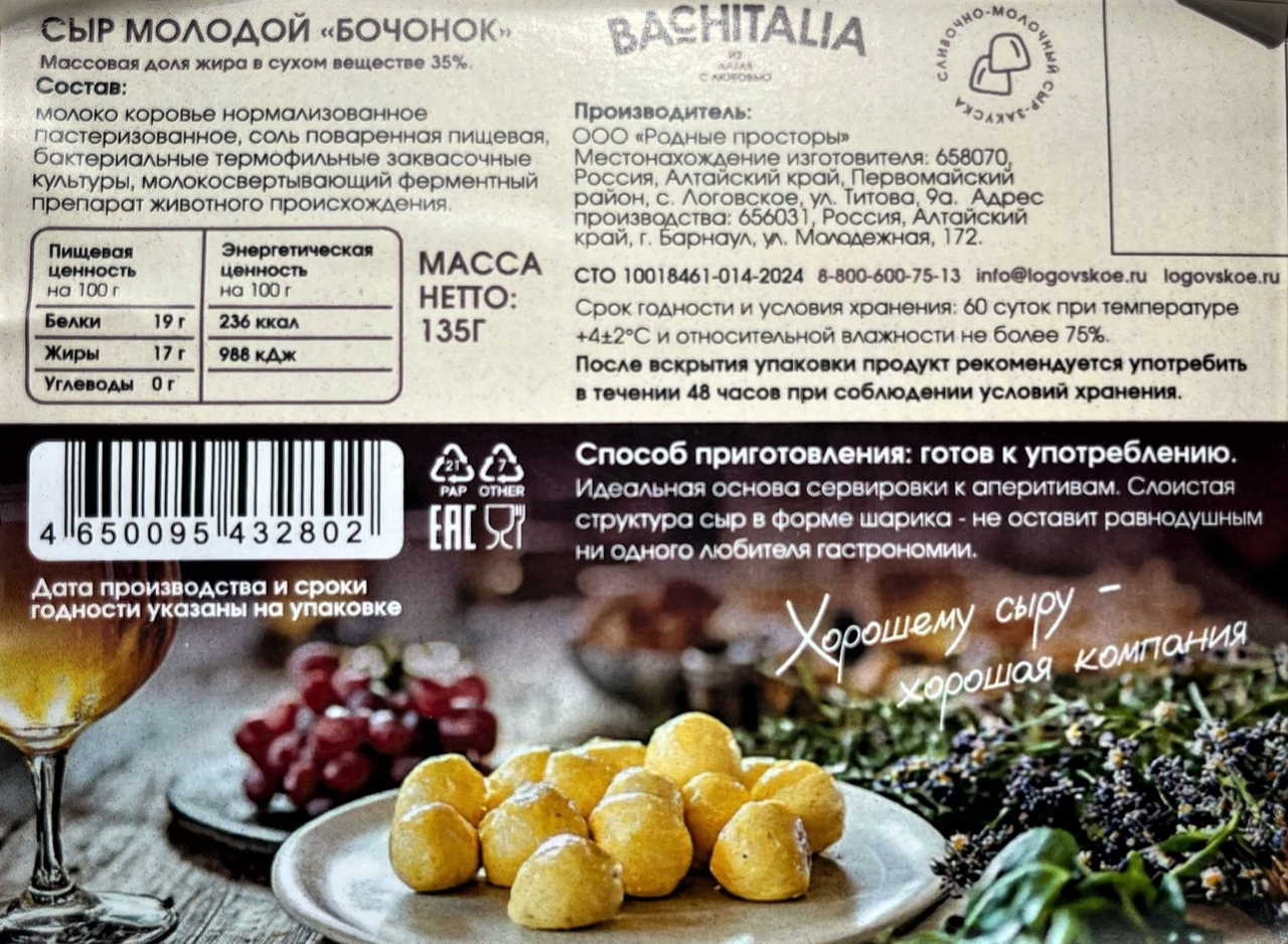 Сыр Bachitalia молодой бочонок 35%, 135г