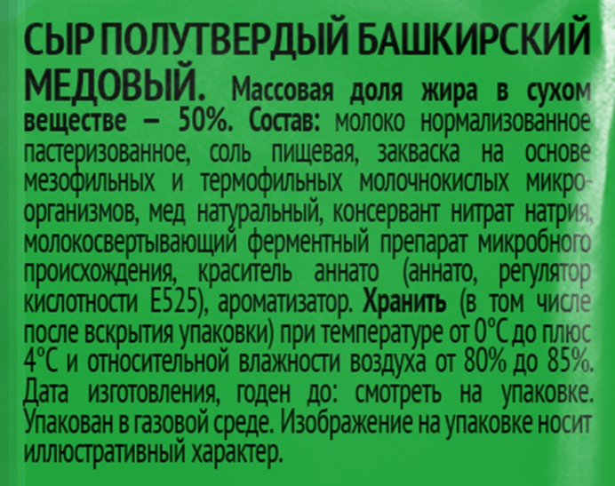 Молоко нормализованное пастеризованное, соль (соль, агент антислеживающий ферроцианид калия), уплотнитель кальция хлорид, закваска на основе мезофильных и термофильных молочнокислых микроорганизмов, мед натуральный, консервант нитрат натрия, молокосвертывающий ферментный препарат микробного происхождения, краситель аннато (аннато, регулятор кислотности гидроксид калия), ароматизатор.
