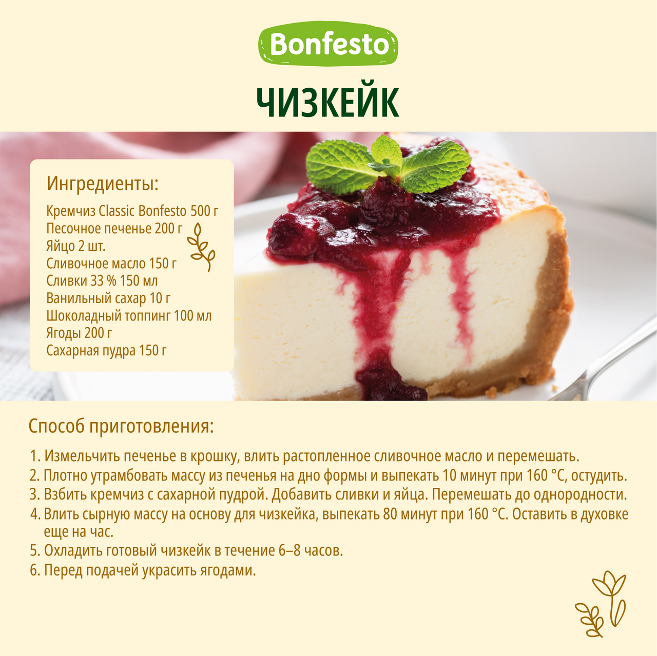 Сыр Bonfesto Cream Cheese Кремчиз 70% мягкий, 500 г – натуральный продукт с нежной кремообразной консистенцией и сливочным вкусом. Он не требует созревания и не подвергается прессованию, поэтому все вкусовые качества и полезные свойства исходного сырья (коровье молоко и сливки) сохраняются максимально. Этот сыр используют при приготовлении соусов, закусок, пасты, как начинку для выпечки. Он также входит в состав некоторых десертов. Консистенция сыра делает его подходящим для намазывания на хлеб.