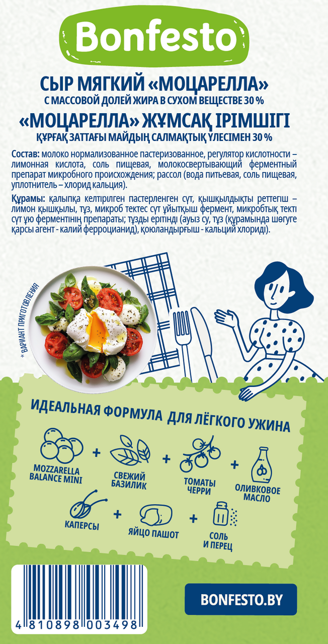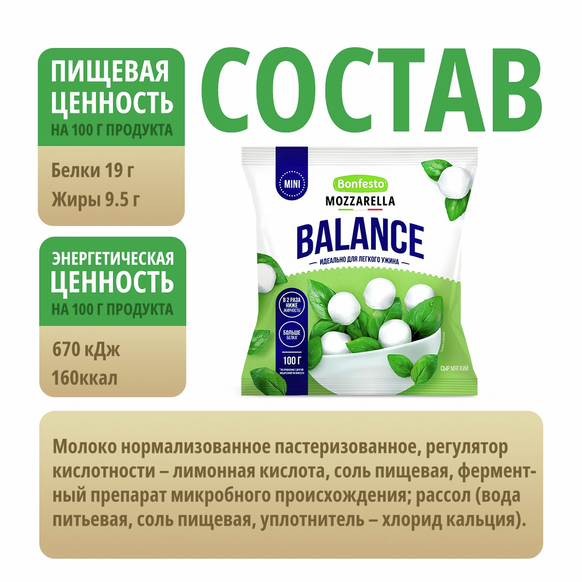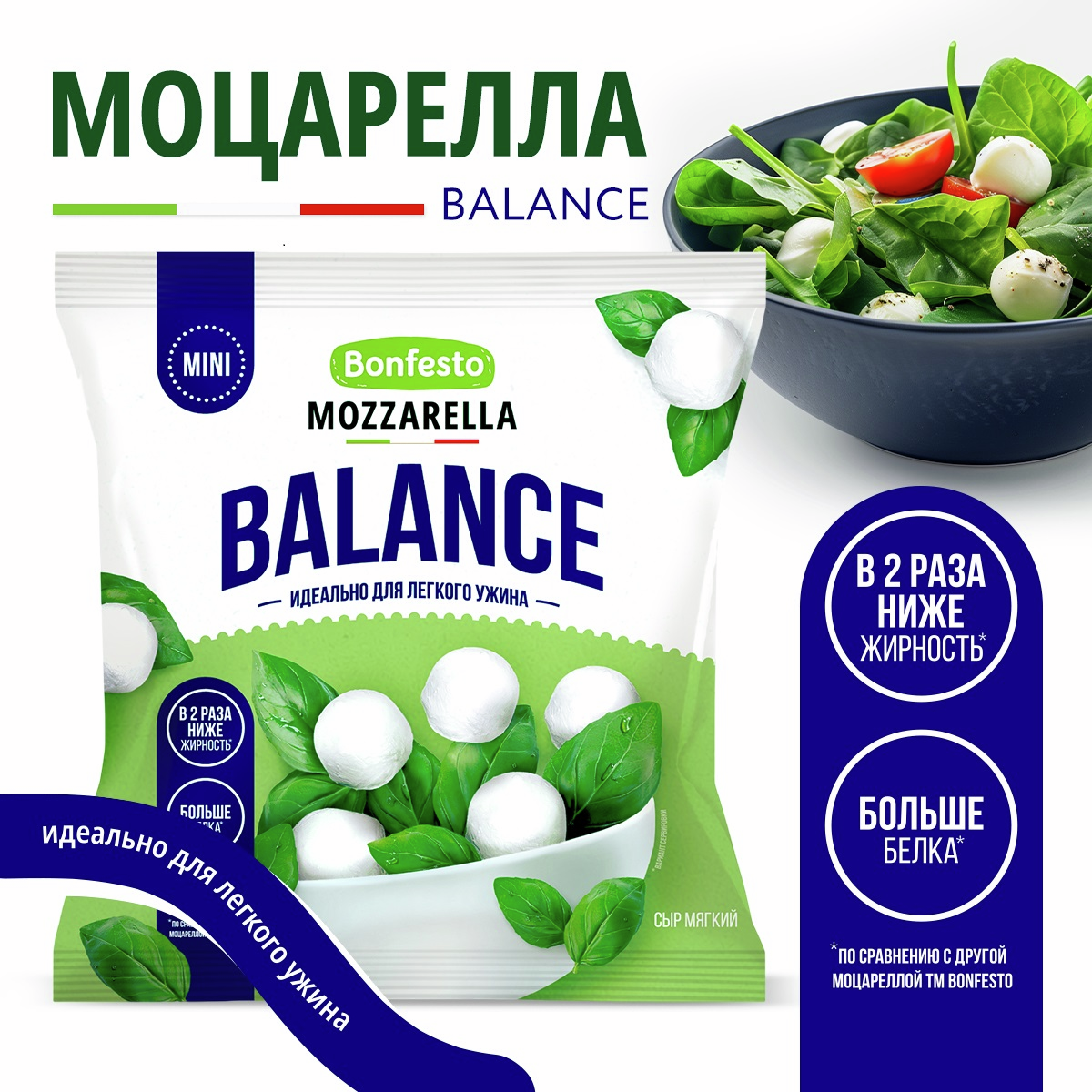 Моцарелла мягкая Balance - сыр, состоящий из 100% натуральных ингредиентов (изготовлен из свежего молока без консервантов, красителей, ароматизаторов и усилителей вкуса) и относится к семейству Паста Филата. Благодаря низкому содержанию жира и более высокому содержанию белка - идеальный продукт для более здорового и сбалансированного питания. Mozzarella bonfesto balance - продукт, который позволит найти баланс белка и жира в составе, в организации своего меню, баланс между временем на перекус и другие дела, баланс в своей жизни. Привычный вкус натурального сыра моцарелла, произведенный из качественного сырья, проходящий многоступенчатый контроль качества.