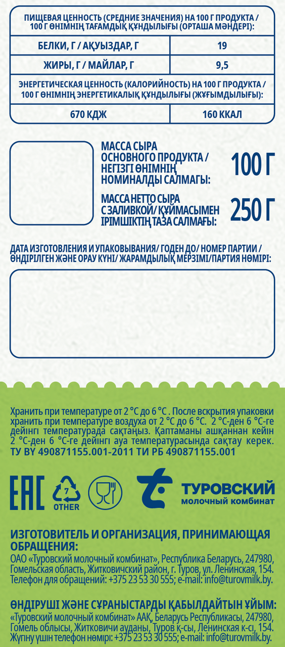 Молоко нормализованное пастеризованное, регулятор кислотности - лимонная кислота, соль пищевая, молокосвертывающий ферментный препарат микробного происхождения, рассол (вода питьевая, соль пищевая, уплотнитель - хлорид кальция).
