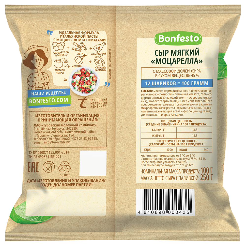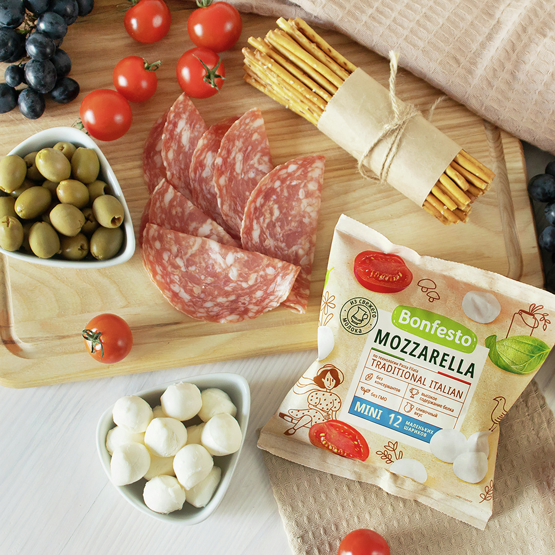 Сыр Моцарелла mini в рассоле Bonfesto, 100 г – натуральный и свежий рассольный продукт, обладающий приятным, слегка солоноватым вкусом и нежной слоистой текстурой. Он выполнен в форме небольших упругих шариков размером с плоды черешни, которые плавают в рассоле. Такая форма позволяет за минимальное время готовить с моцареллой различные закуски, канапе и салаты. Одним из наиболее популярных блюд с этим продуктом считается капрезе: при этом кусочки сыра на блюде чередуют с зелеными листьями свежего базилика и красными кружочками спелых томатов. Моцарелла хорошо плавится и может быть использована также для приготовления домашней пиццы. Сыр произведен по традиционному рецепту итальянской кухни с использованием бактериальной закваски и не содержит растительных жиров, консервантов и других искусственных добавок.