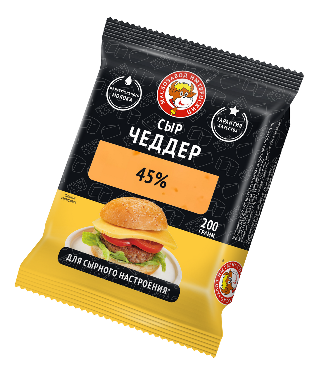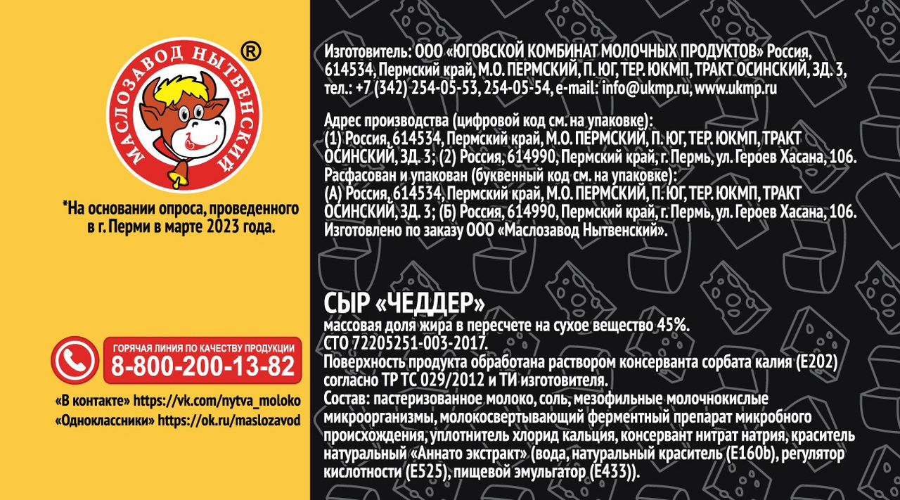 Сыр Маслозавод Нытвенский Чеддер полутвердый 45%, 200г
