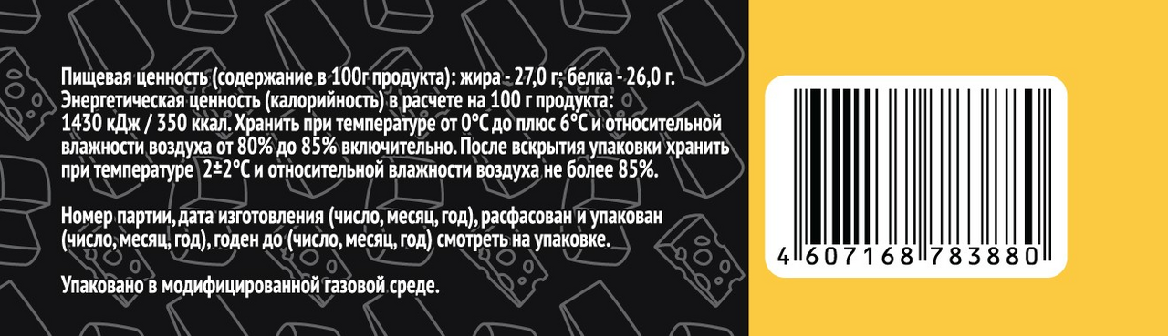 Пастеризованное молоко, соль, мезофильные молочнокислые микроорганизы, молокосвертывающий ферментный препарат микробного происхождения, уплотнитель хлорид кальция (Е509), консервант нитрат натрия (Е251), пищевая добавка: краситель натуральный Аннато экстракт (Е160b): (вода, натуральный краситель (E160b), регулятор кислотности (Е525), пищевой эмульгатор (Е433)).