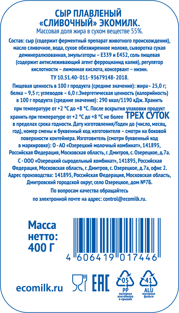 Сыр плавленый Экомилк Сливочный 55%, 400г